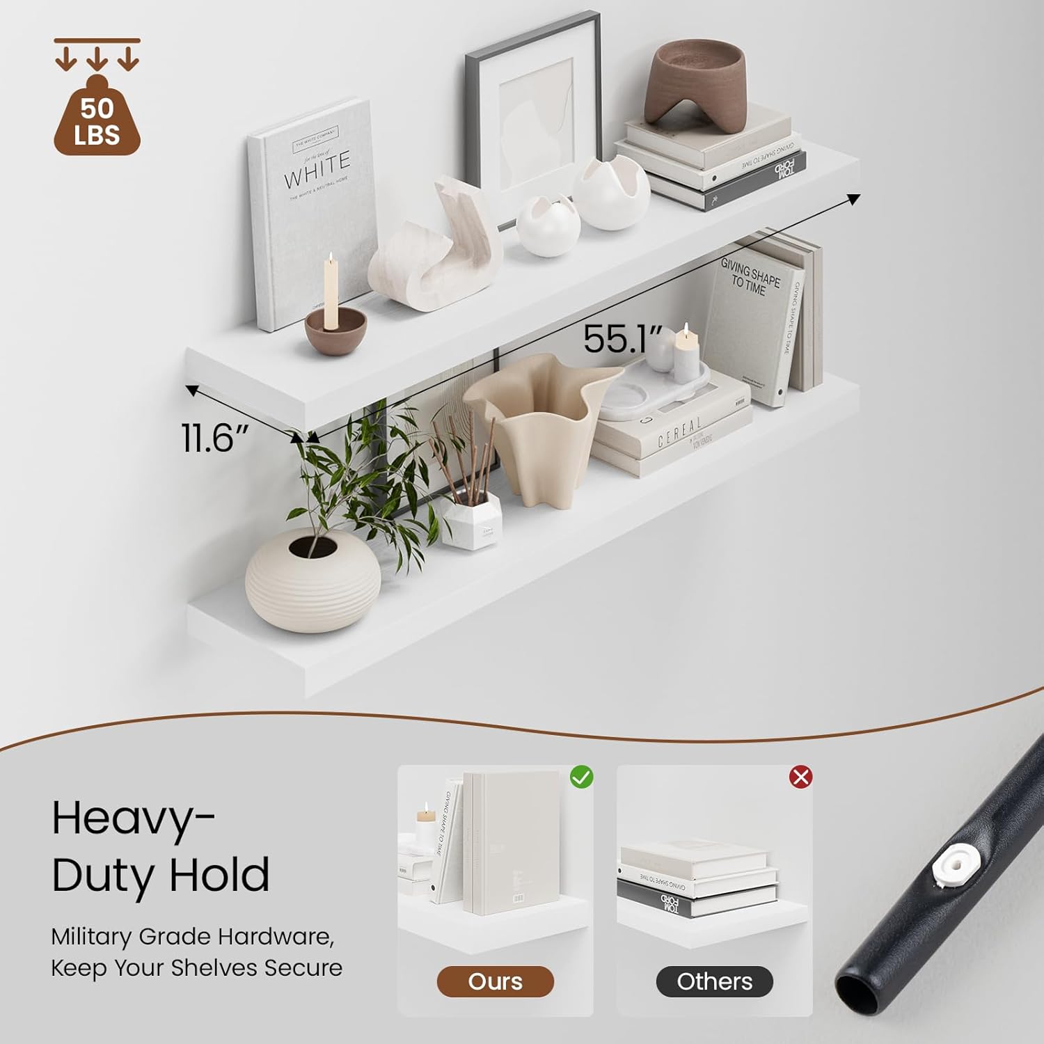 Heimlove 55 x 12 inch Extra Long Floating Shelves for Wall, 12 Inch Deep Floating Shelves, Large Display Shelf & Storage Shelf for Living Room Bedroom Kitchen Home Office, Set of 2, White