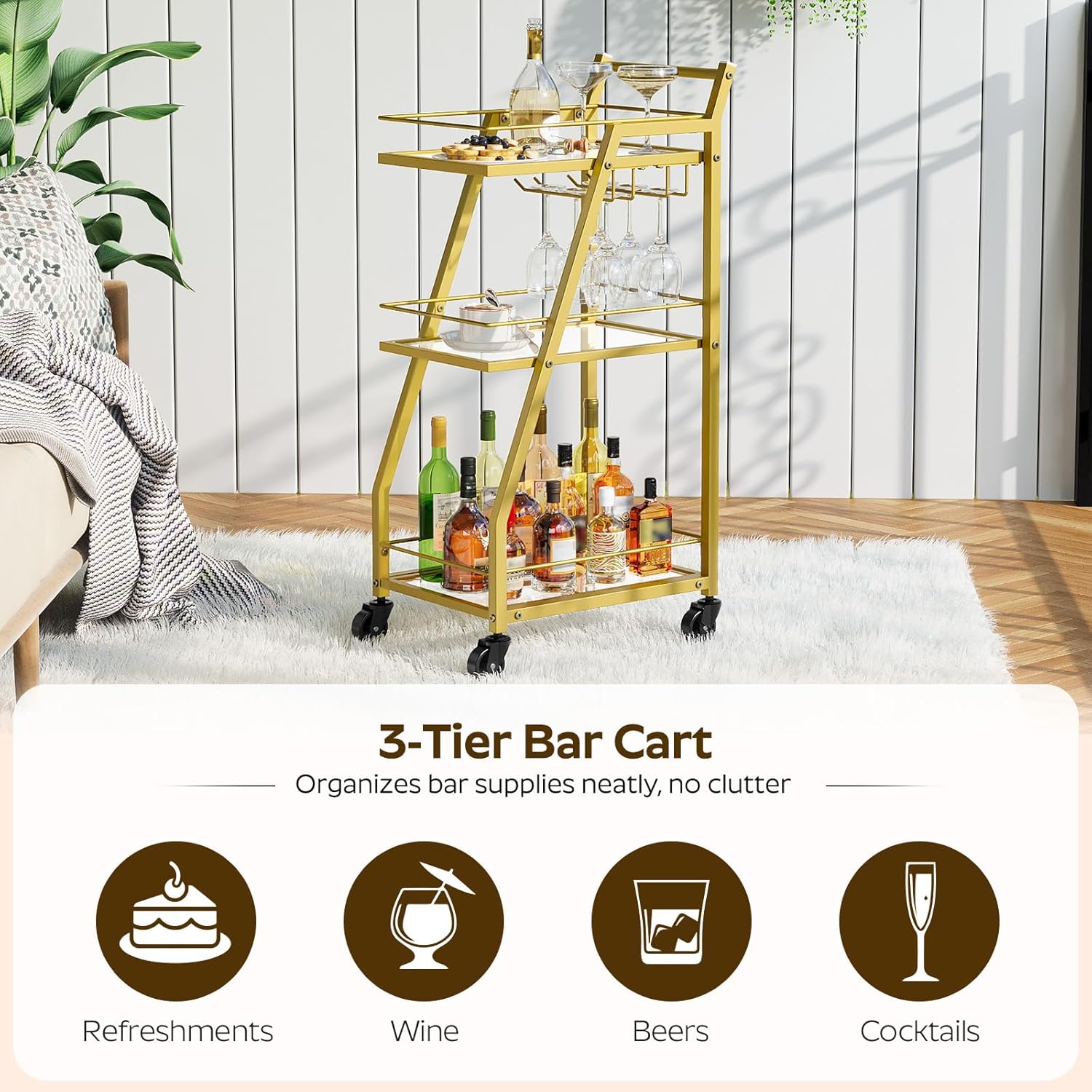 Bar Cart, 3-Tier Bar Cart for The Home, Home Bar Serving Cart with Glass Holders, Beverage Cart for Kitchen, Dining, Party Room, Gold BC03GD