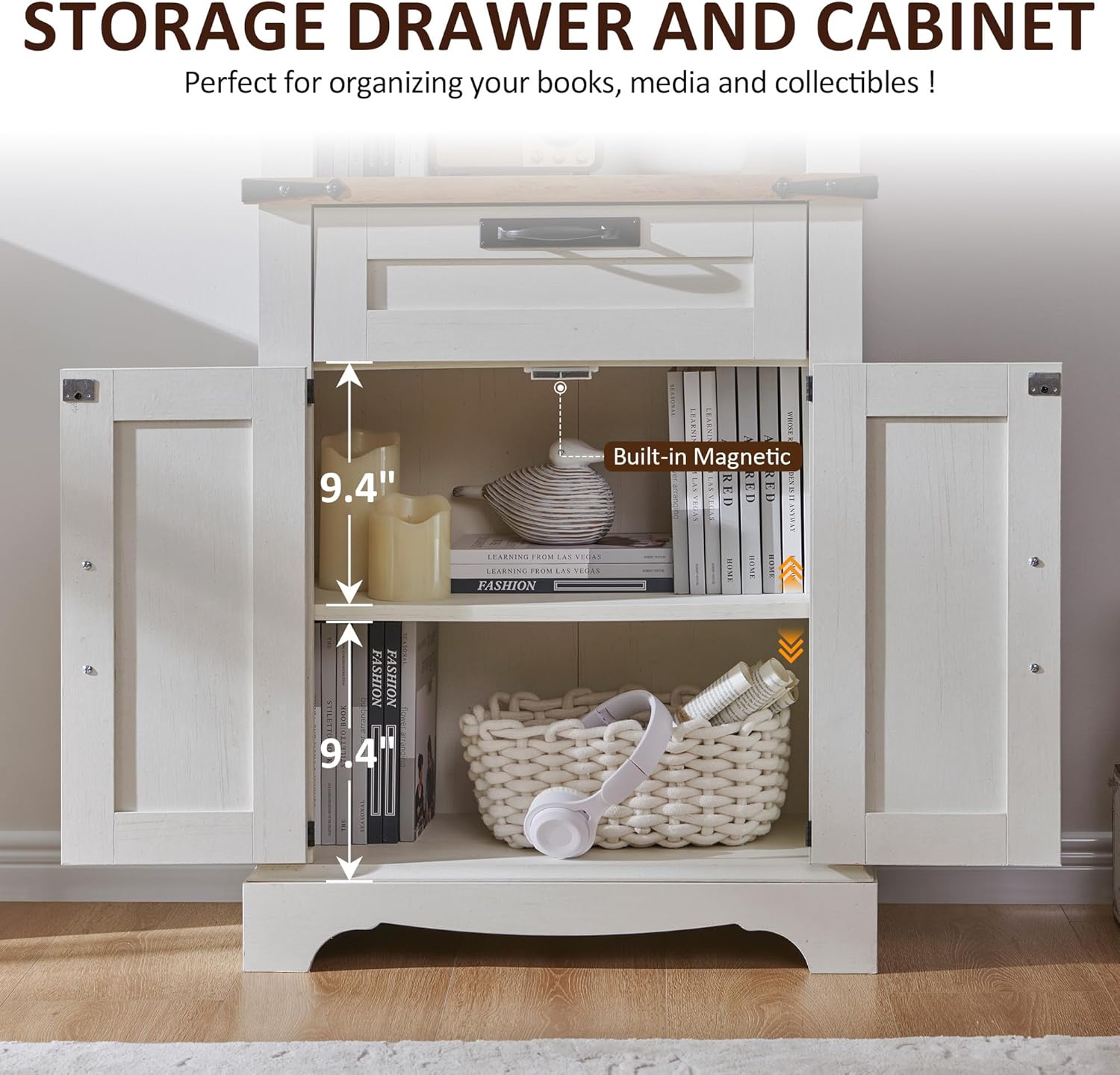 - Large Storage Space: This bookcase with drawer feature with 5 spacious adjustable shelves , 1 drawers and a colsed cabinet with barn door design, providing ample storage for all your books and decor items. Dimensions: 71.4"H x 23.6"W x 11.8"D. Whether in your living room, bedroom, or home office, this white bookshelf with a versatile storage cabinet is the perfect addition to your space