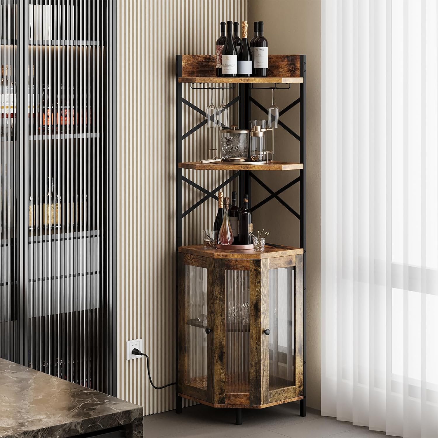 Corner Bar Cabinet with Power Outlet, 5-Tier Corner Wine Cabinet with Led Strip and Glass Holder, Industrial Tall Liquor Cabinet Bar Wine Rack for Home, Rustic Brown