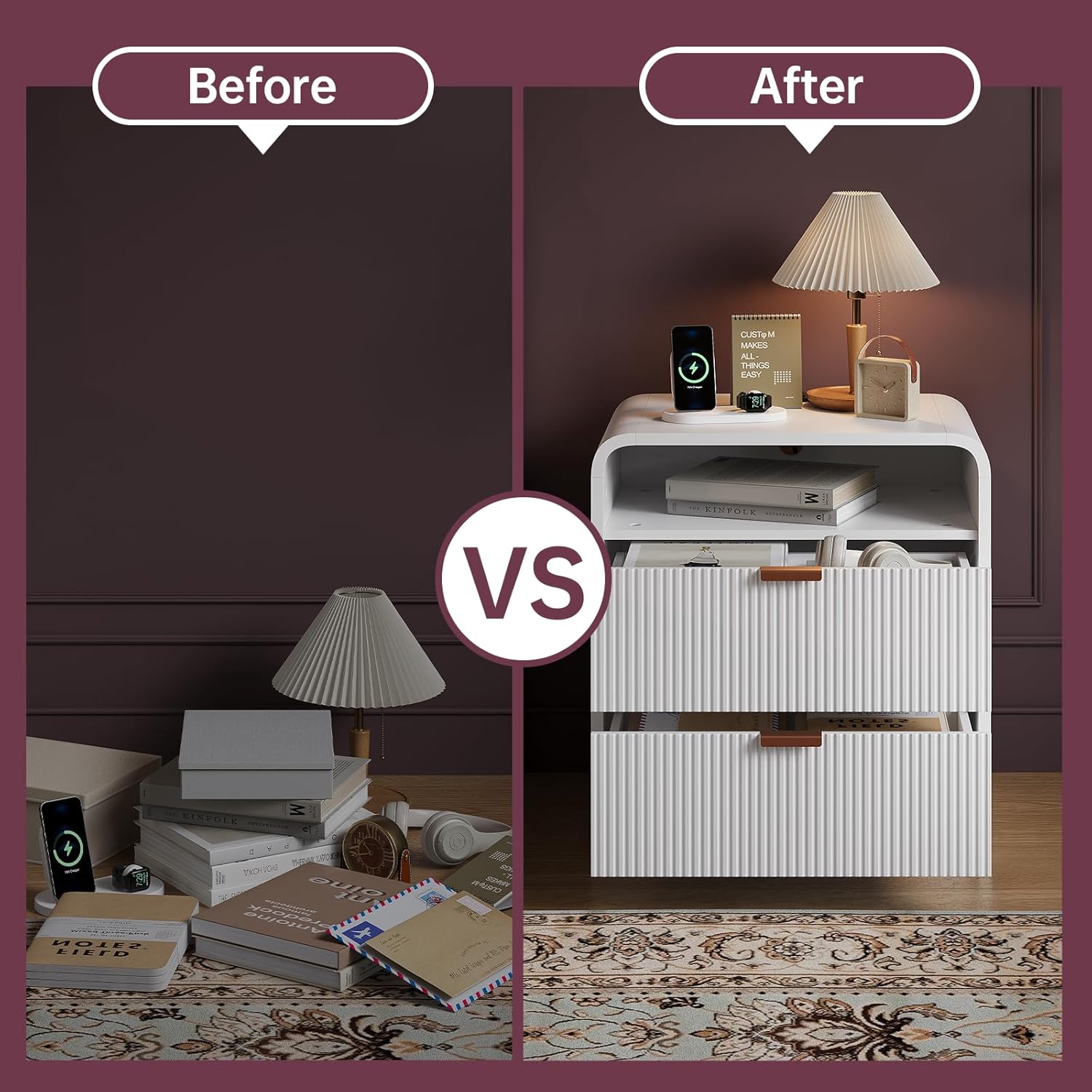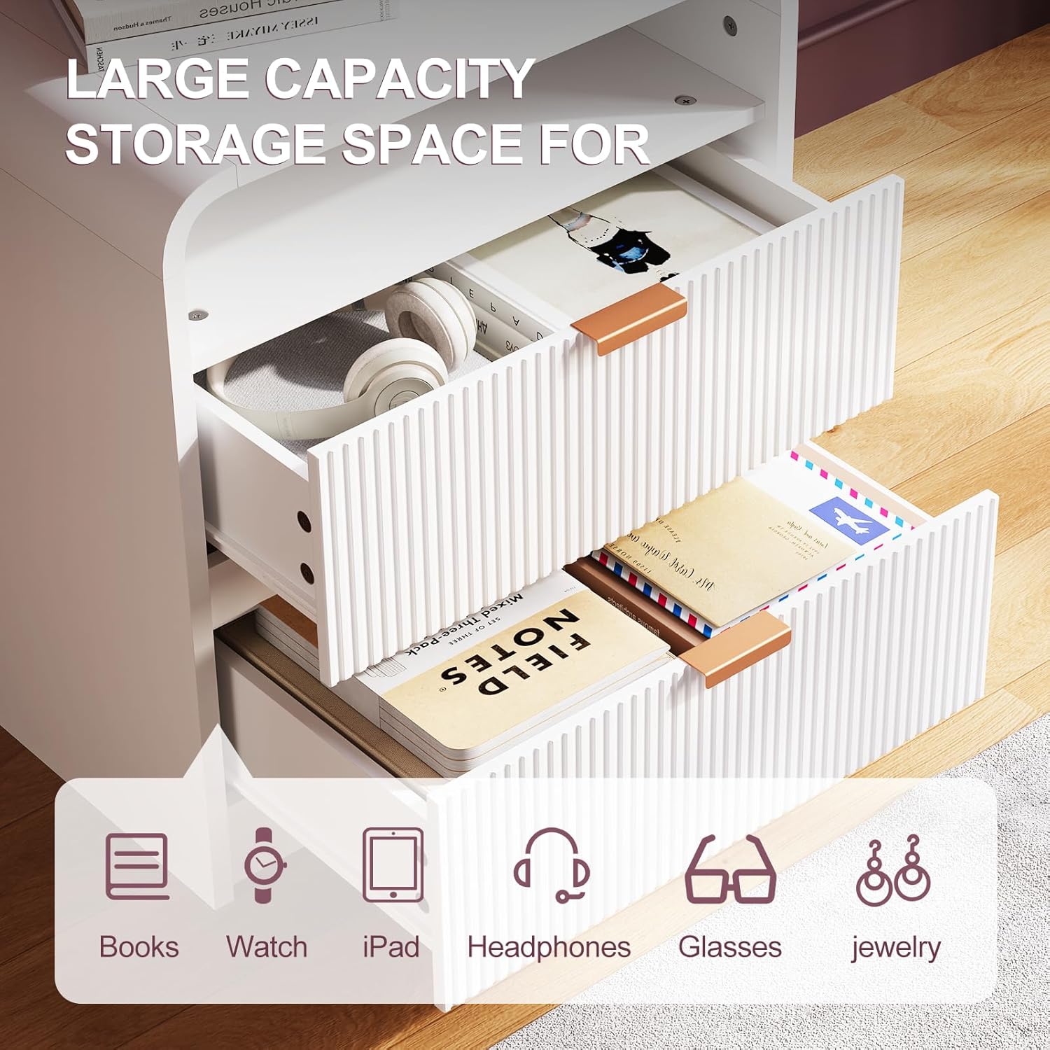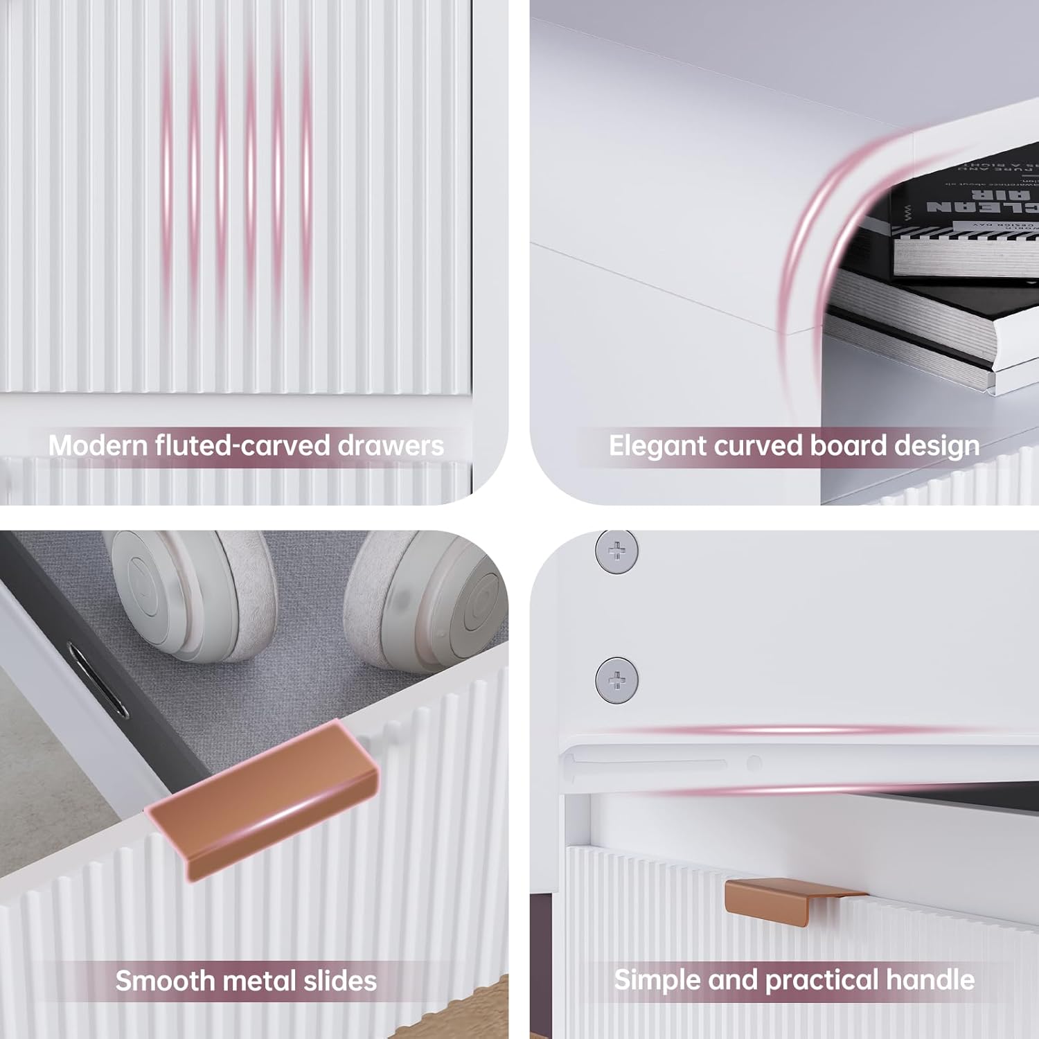 FURSUN 24" Fluted Nightstand with Charging Station, Wooden End Table with 2 Drawers Storage, Curved Profile Design, Modern Bedside Cabinet for Bedroom Living Room, White