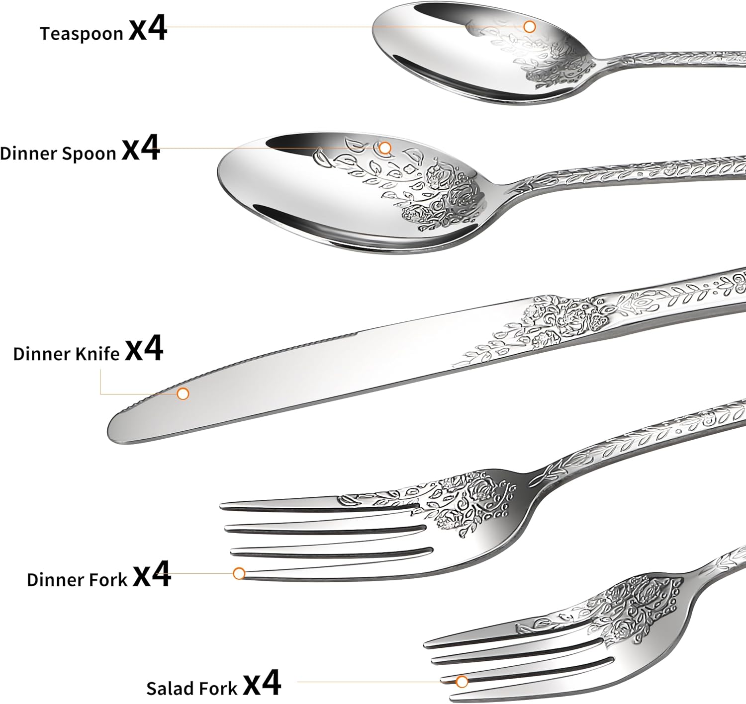 - WONDERFUL WORKMANSHIP AND FUNCTIONAL---Our utensils set is made of multiple mirror polishing treatment, silverware set with floral design Each piece is beautifully adorned with a delicate floral pattern,edge smooth , elegant and classical appearance, adding to the beautiful experience of everyday dining.