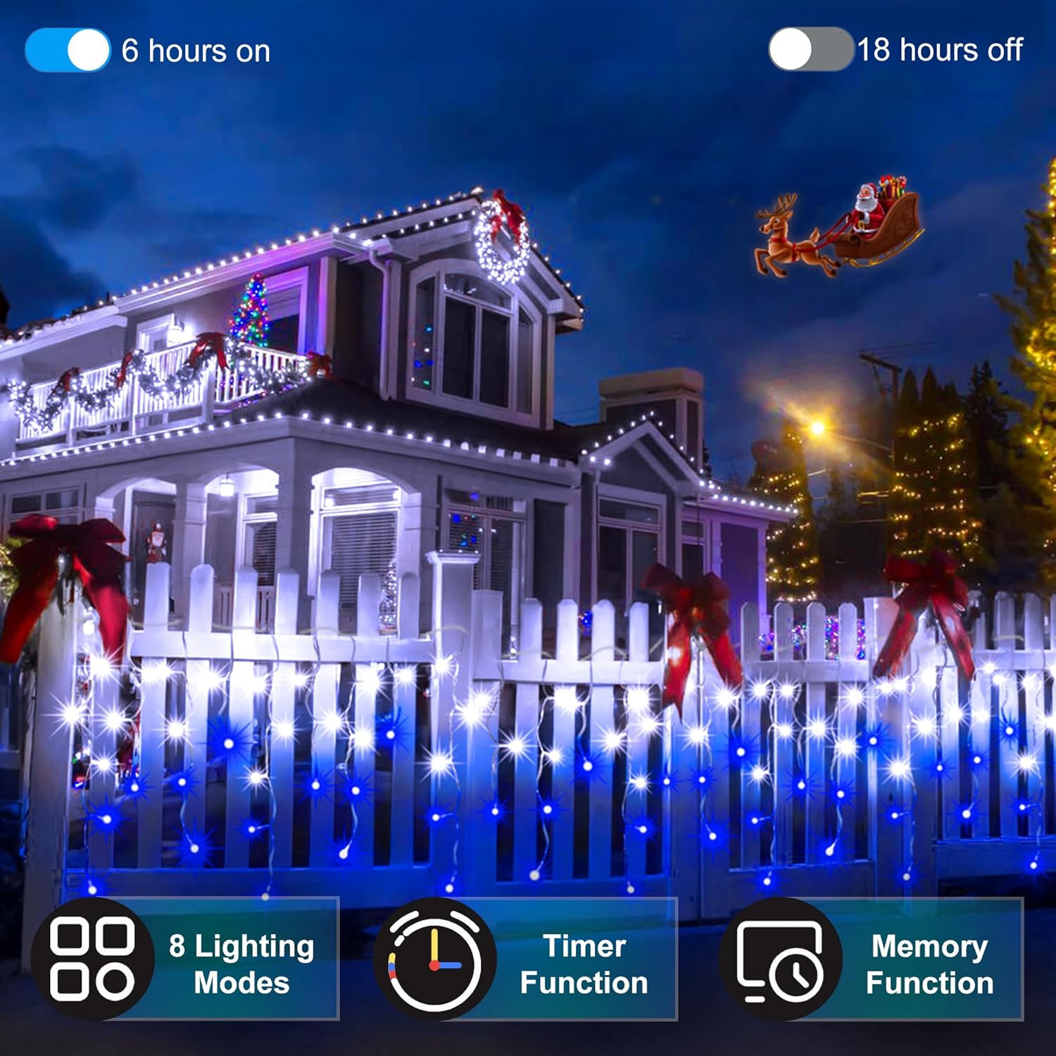 - Dual-Tone Cool White & Blue Icicle Lights: Create a captivating winter wonderland with this 60ft LED icicle string lights featuring cool white and blue LEDs. With 612 energy-efficient bulbs and 136 drops, these lights produce a stunning frosty aqua glow that mimics glacial elegance. Perfect for outlining rooflines, windows, fences, and trees, this dual-color combination creates a magical frozen effect ideal for both residential and commercial holiday decorating