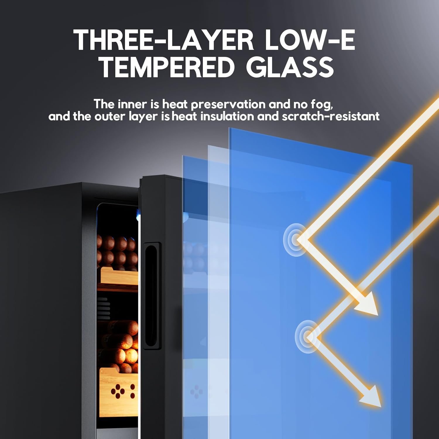 - 【Low-E Triple Tempered Glass Door】We add Low-E composite coating to the middle layer of the glass, which makes the thermal insulation and heat preservation performance of the glass far superior to its peers. Cigar humidor has an Elegant appearance, equipped with a hidden door handle and 4 adjustable non-slip feet, built-in LED blue light, convenient for you to check the status of your cigars. The LED touch screen panel is equipped with a digital thermometer and hygrometer, intelligent control, and faster response.