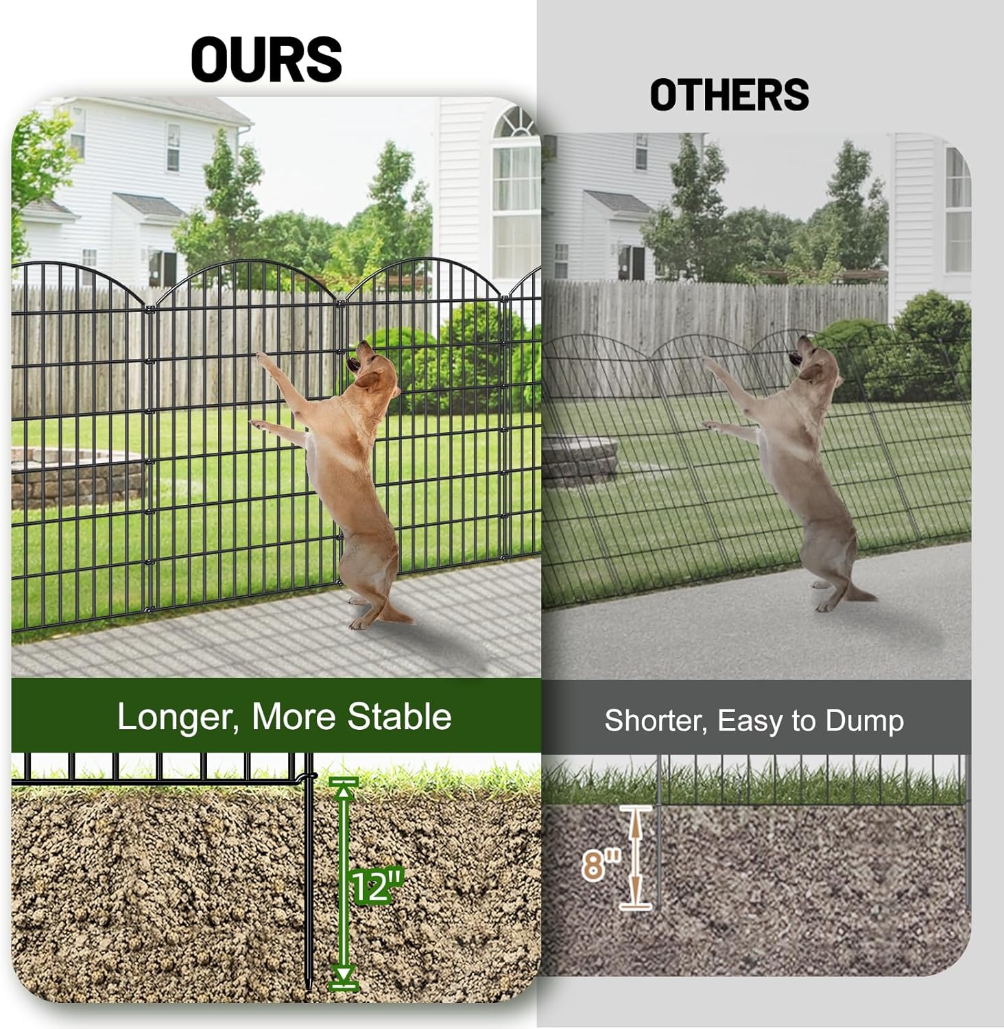 - STURDY AND STABLE: This tall garden fence 48 inches is welded by Gauge 9 thickness iron wires, the stakes are 10mm in diameter, and can be extended pretty far into the ground which is fairly steady, it works well as a garden fence border for big or medium size dogs.
