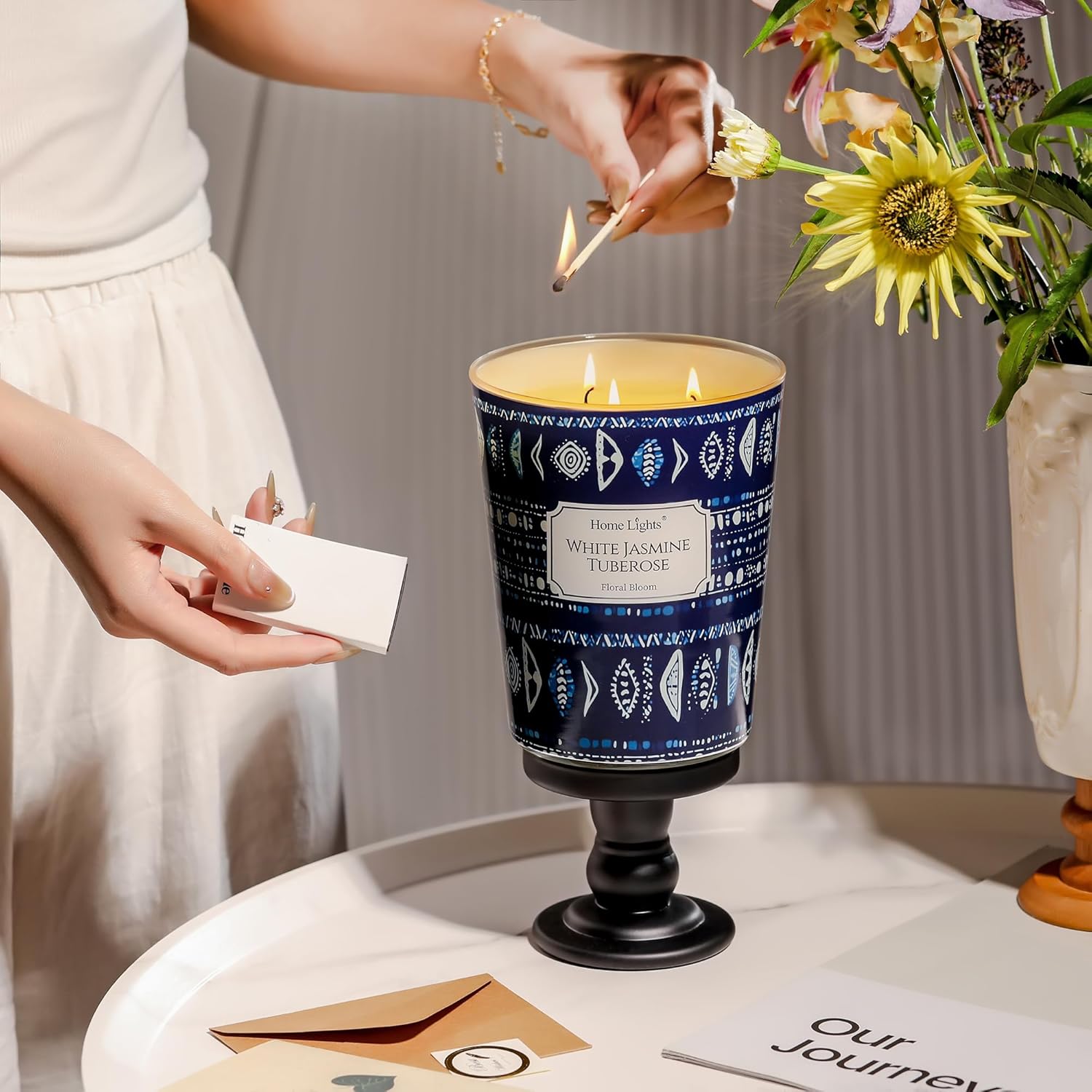 - 【White Jasmine Tuberose Fragrance for Relaxation】3-Wick Candles capture the essence of White Jasmine Tuberose with its fresh, floral top notes, a heart of lush jasmine blossoms, and a creamy, velvety base of tuberose. Perfect for cultivating a serene and elegant ambiance in living rooms, bedrooms, or bathrooms.