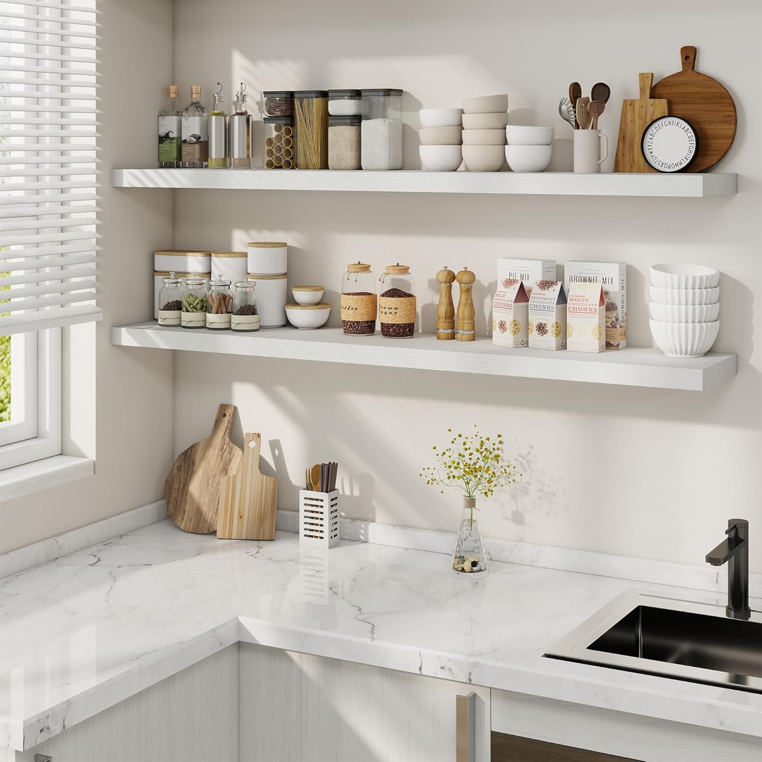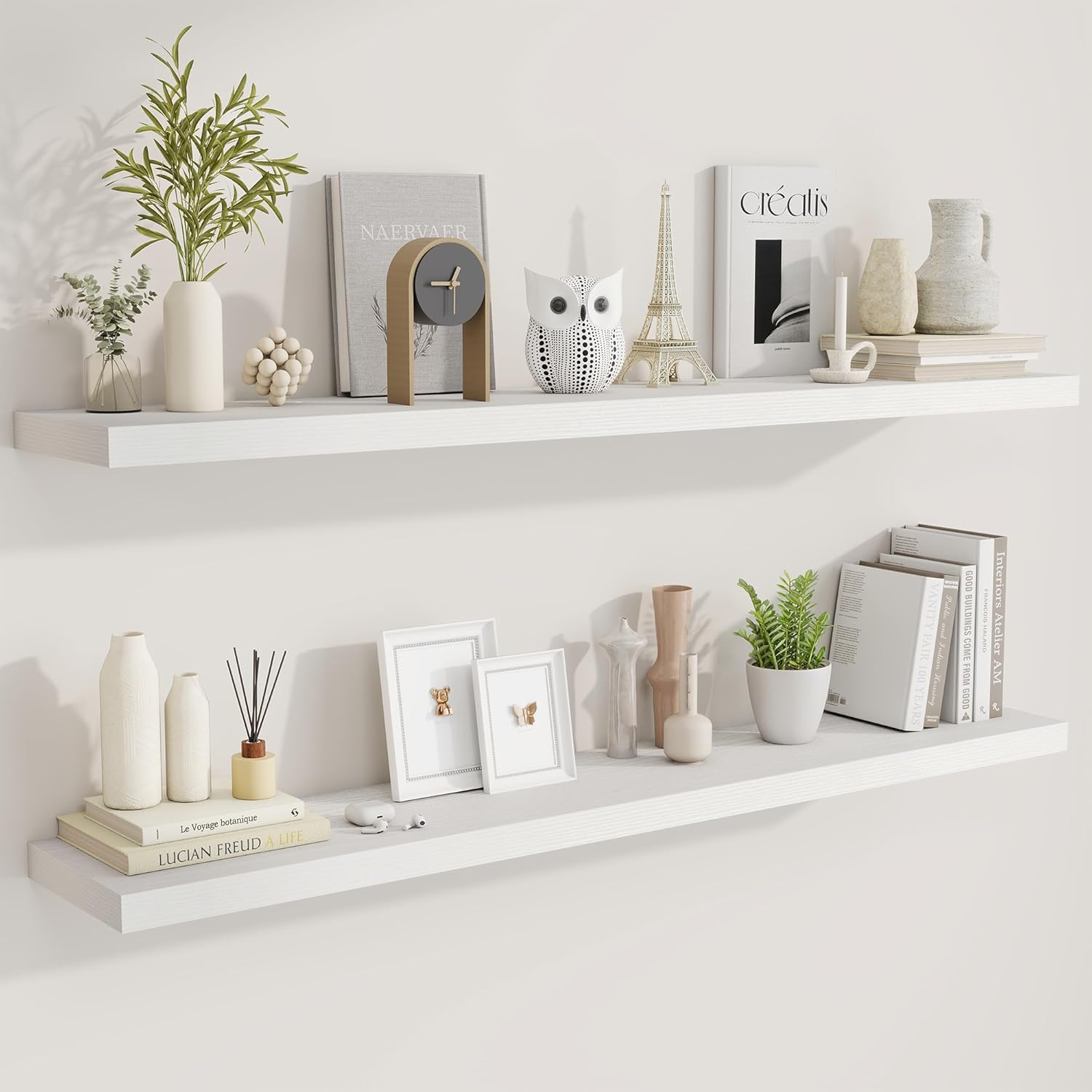 Fun Memories 55 Inch Fireplace Mantel Shelf -Long Floating Shelves, Deep Wall Mounted Farmhouse Display Shelves with Invisible Heavy Duty Metal Bracket, White, 2 Pack