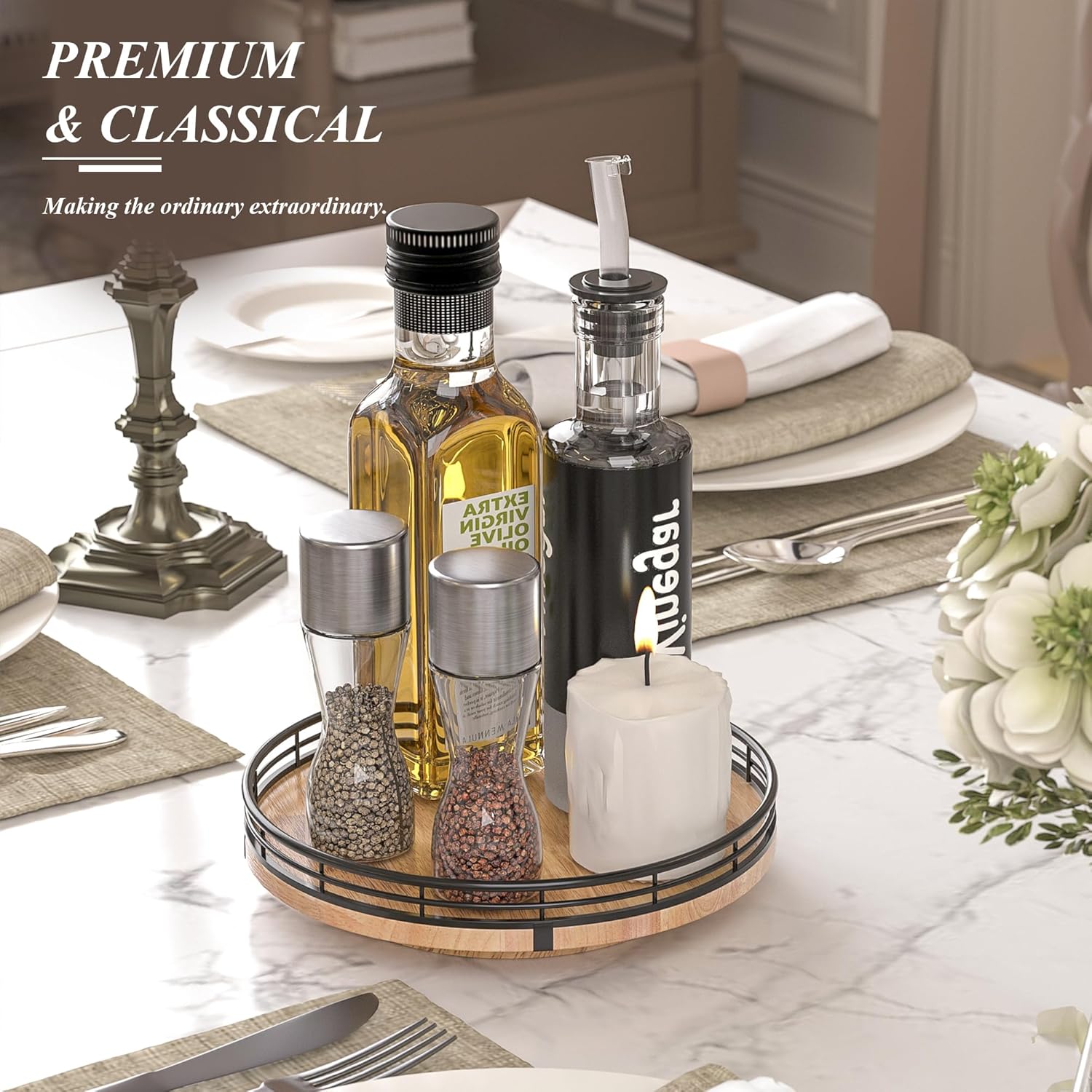 - PREMIUM MATERIAL: Our farmhouse lazy Susan organizer is made of natural solid oak wood and strong metal, sturdy, durable and premium quality. This wooden turntable organizer is a game-changer for keeping your kitchen organized. The farmhouse oak finish gives it a rustic, charming look that will fit perfectly with your kitchen decor.