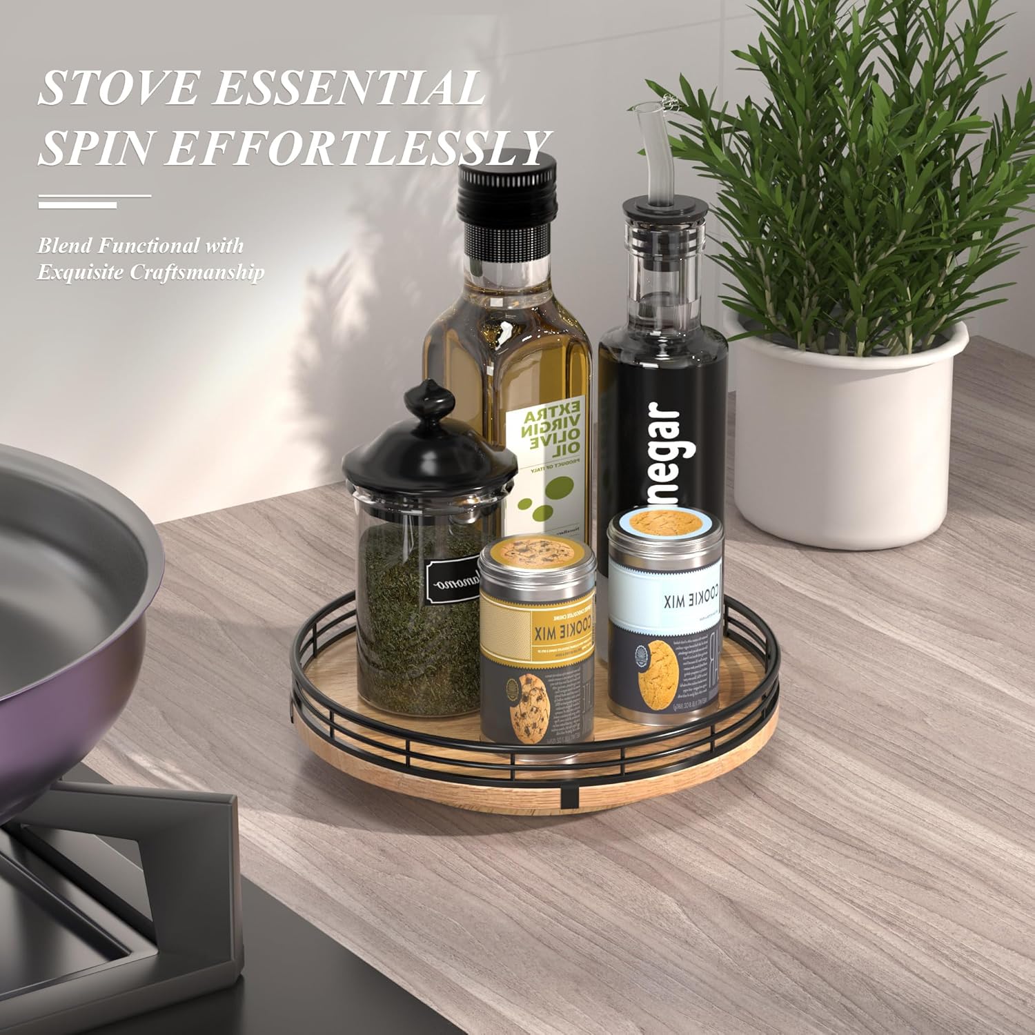 - 360 RATATING & MAXIMIZE SPACE: The base is made of solid wood and the spinning mechanism is made of steel ball bearings, which are well-built and allow for 360° smoothly spin. Making it super easy to access items at the back of your cabinet without having to remove everything in front. You can use it to store spices, condiments, and even small jars, and it keeps everything neatly in place.
