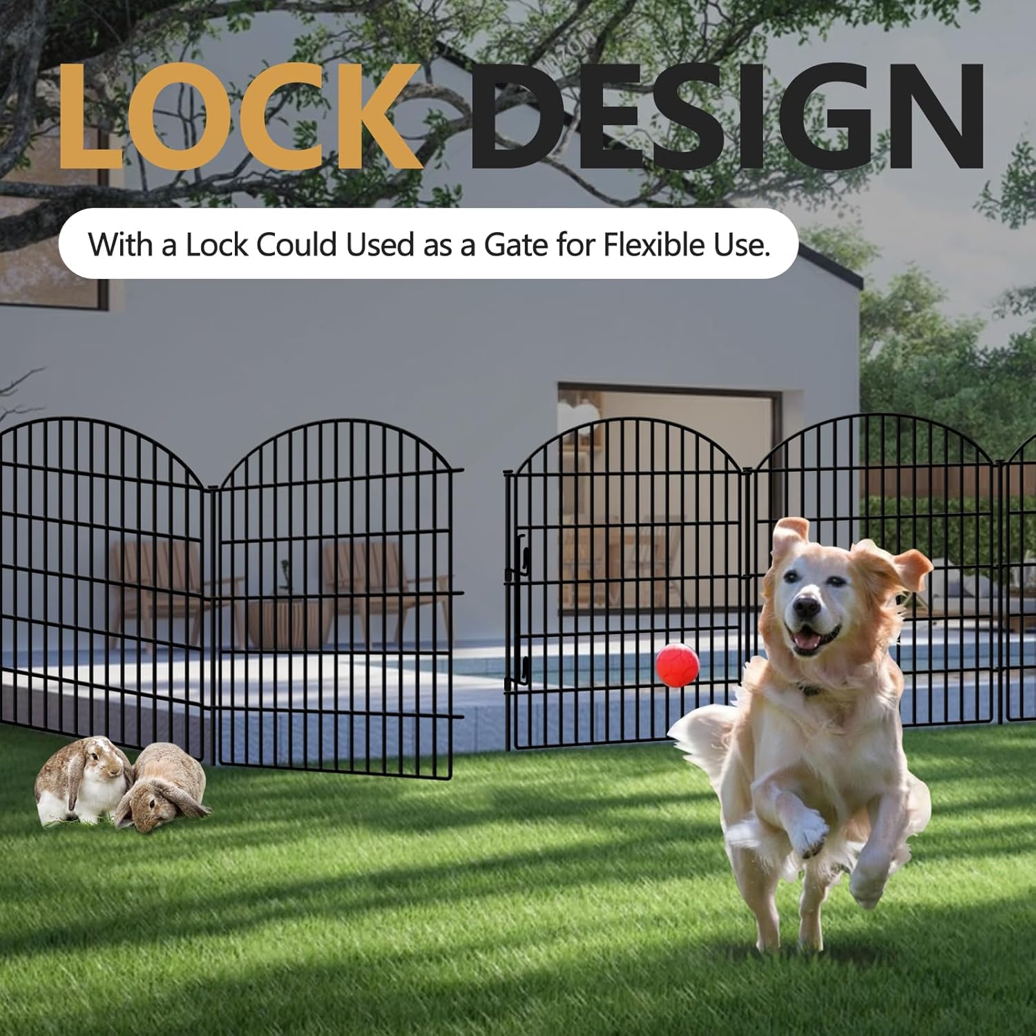- MORE AVAILABLE SIZE: The classic arch shape design garden fence single piece measures 26.77" wide, 33" high, 1.5" gap. Comes with 16 metal stakes are 44" in height, which can be inserted into about 12.6 inches above the ground, making it strong enough to prevent animals from entering & leaving, dog digging, and even keep rabbits away from your plants. A total of 15 fence panels with a lock, connecting 16 fence stakes, the total length of the garden fence is approximately 32.87 ft.