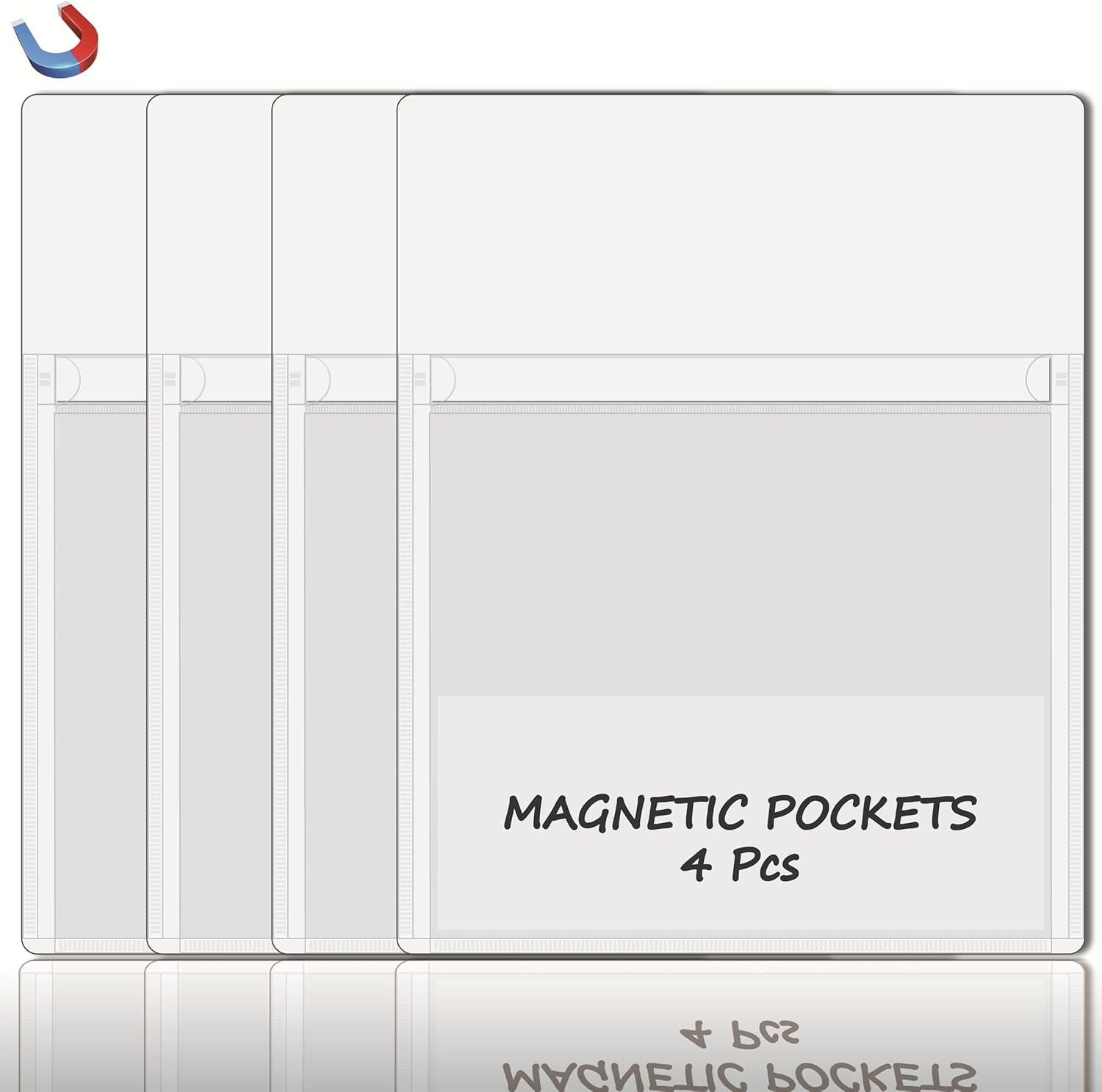 Magnetic Pocket 4 Pack – Self-Adhesive Magnetic Storage Pouch for Documents, Notes & Tools, Strong Magnet Backing for Fridge, Whiteboards, and Metal Surfaces (White 4Pcs)