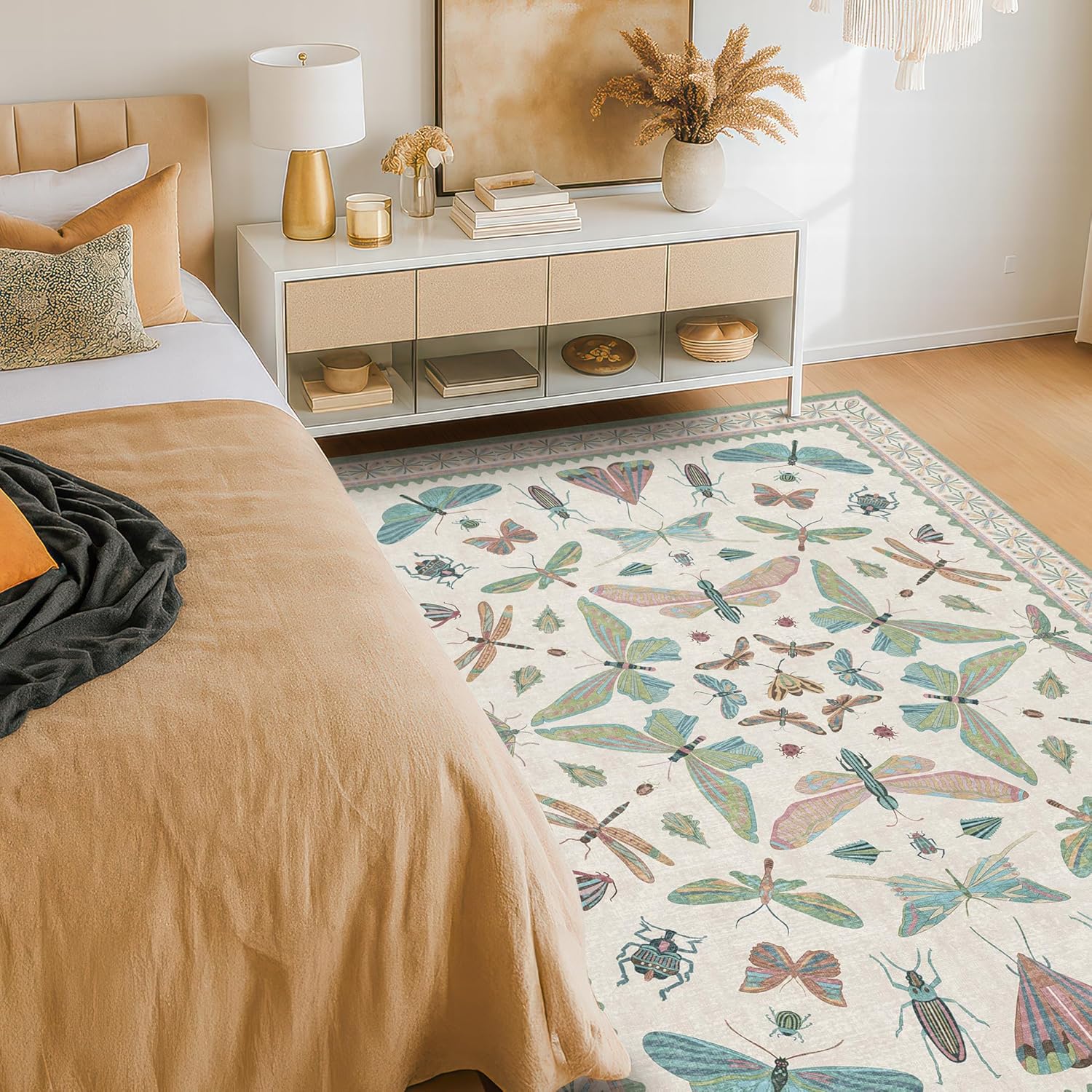 Light Blue and Pink Rug 4x6 Rugs for Bedroom Under Bed - Insect Print Multi Color Decor, Low Pile Non Slip Stain Resistant Throw Rug for Nursery Room Boys, Kitchen, Floor Carpet Aesthetic