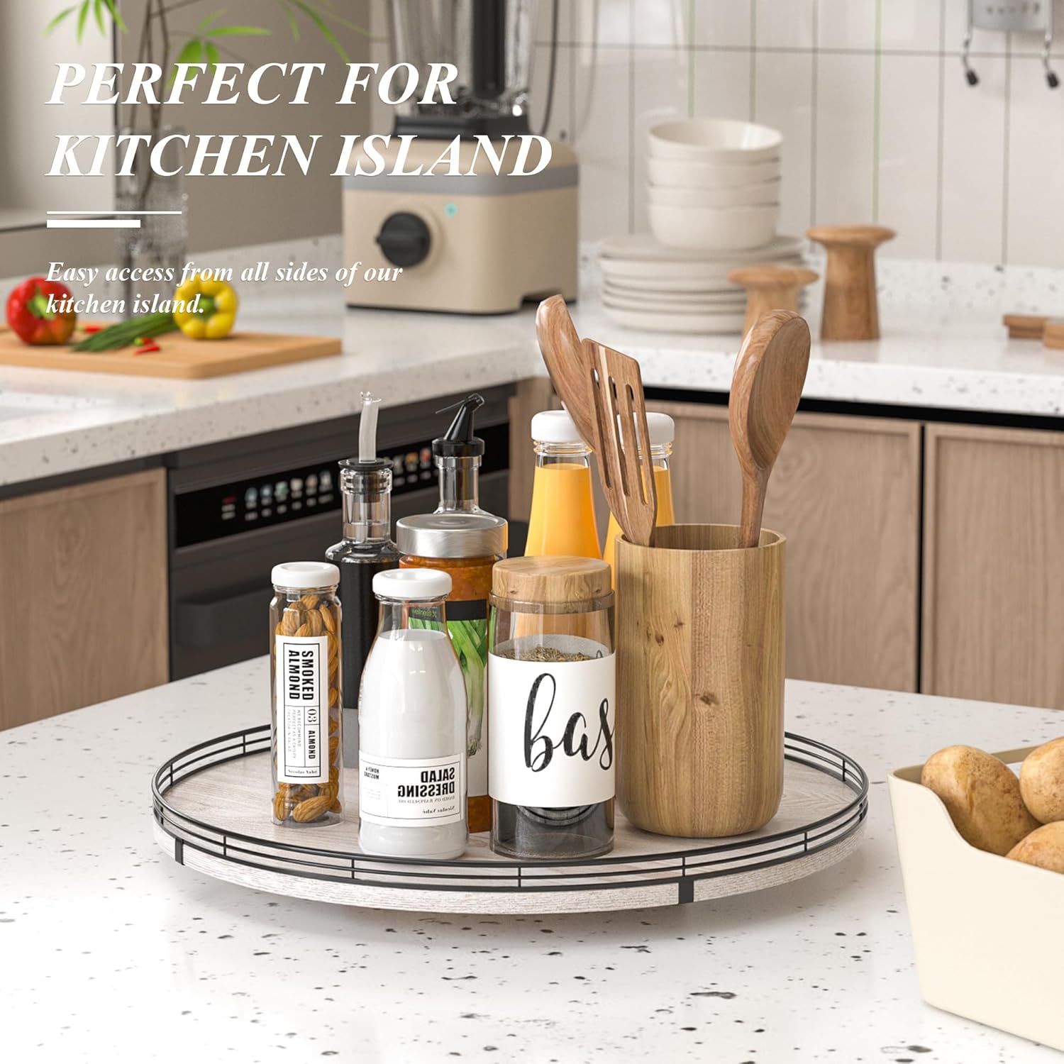 - PREMIUM MATERIAL: Our farmhouse large lazy Susan organizer is made of natural wood and strong Iron, sturdy, durable and premium quality. This wooden turntable organizer is a game-changer for keeping your kitchen organized. The farmhouse finish gives it a rustic, charming look that will fit perfectly with your kitchen decor.