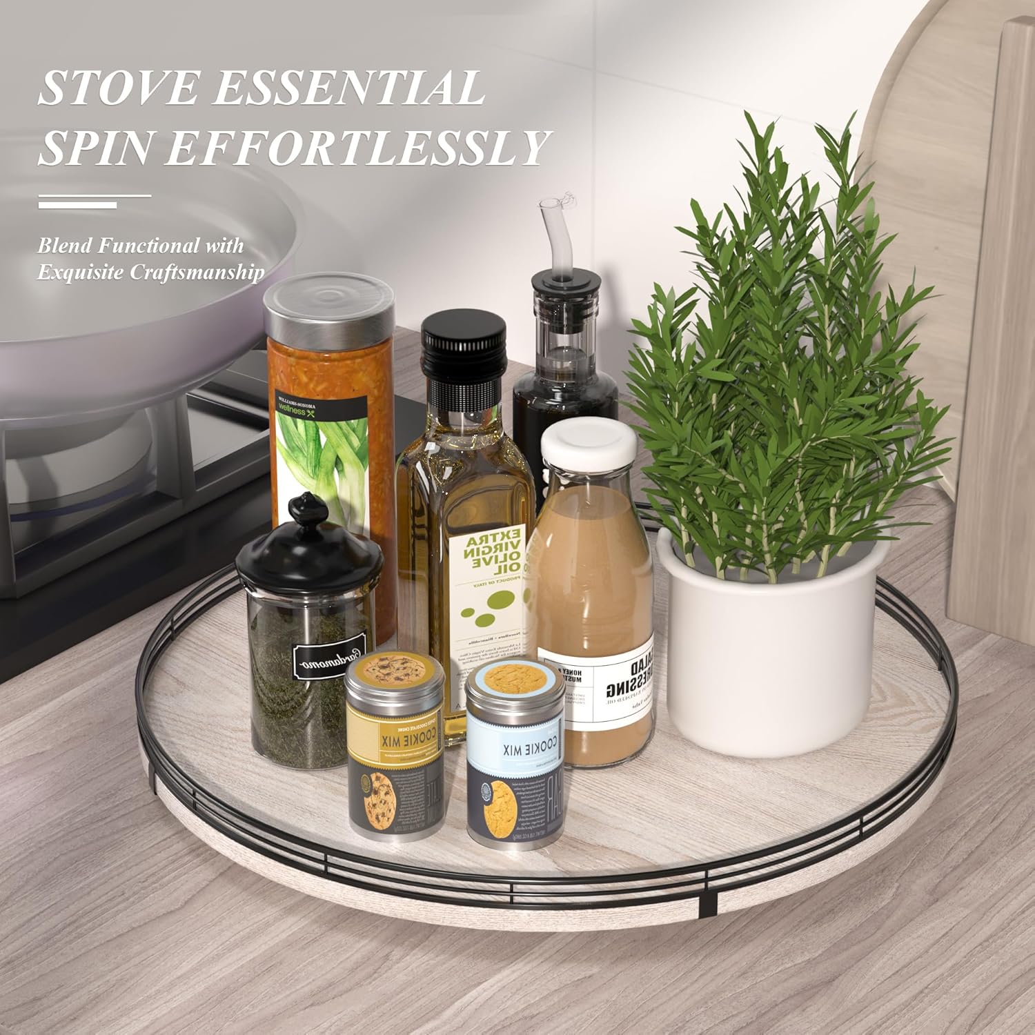 - 360 RATATING & MAXIMIZE SPACE: The base is made of solid wood and the spinning mechanism is made of steel ball bearings, which are well-built and allow for 360° smoothly spin. Making it super easy to access items at the back of your cabinet without having to remove everything in front. You can use it to store spices, condiments, and even small jars, and it keeps everything neatly in place.