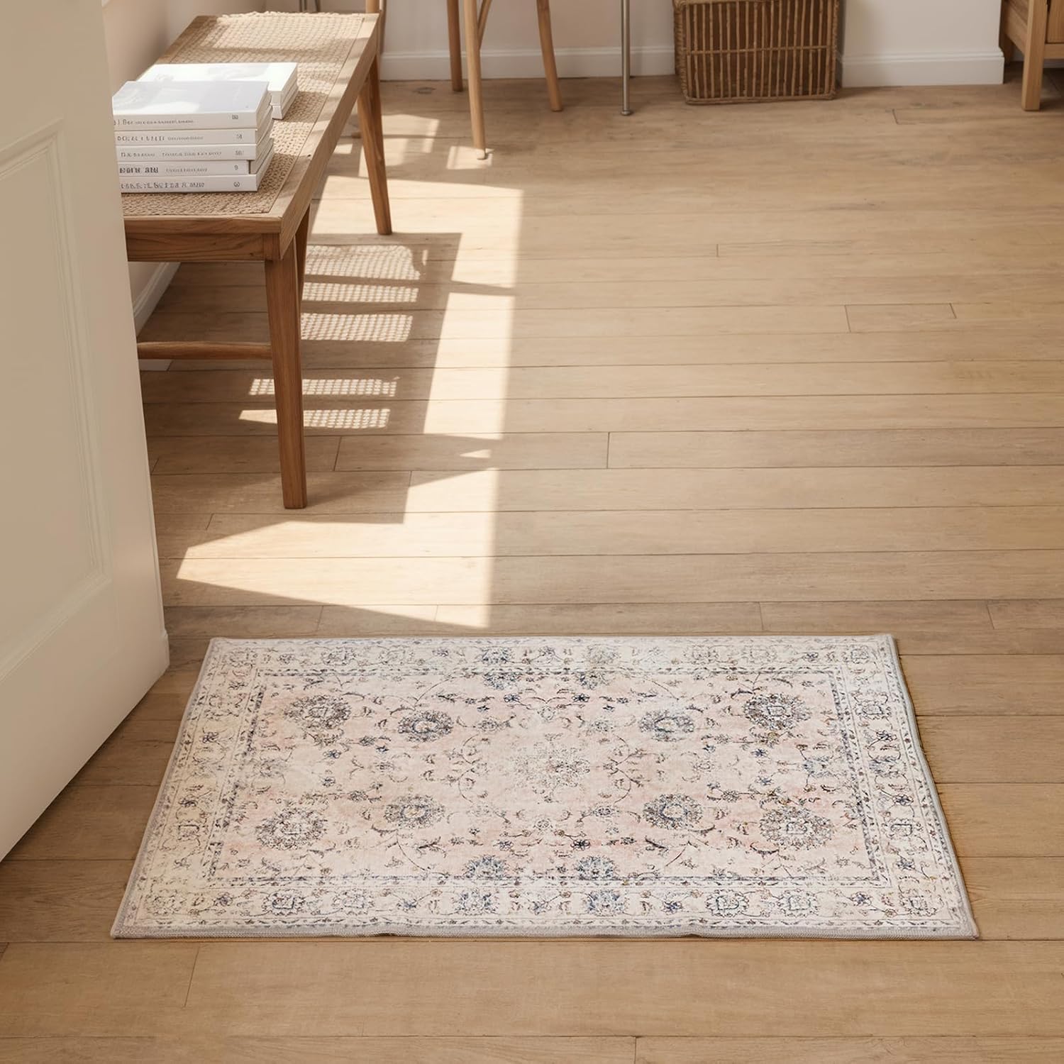 3'x5' Vintage Floral Rug - Persian Inspired Low-Pile Faux Wool Area Rug, Non-Slip Washable Small Rug for Bedroom, Nursery, Dorm, Soft Pink Boho Chic Decor