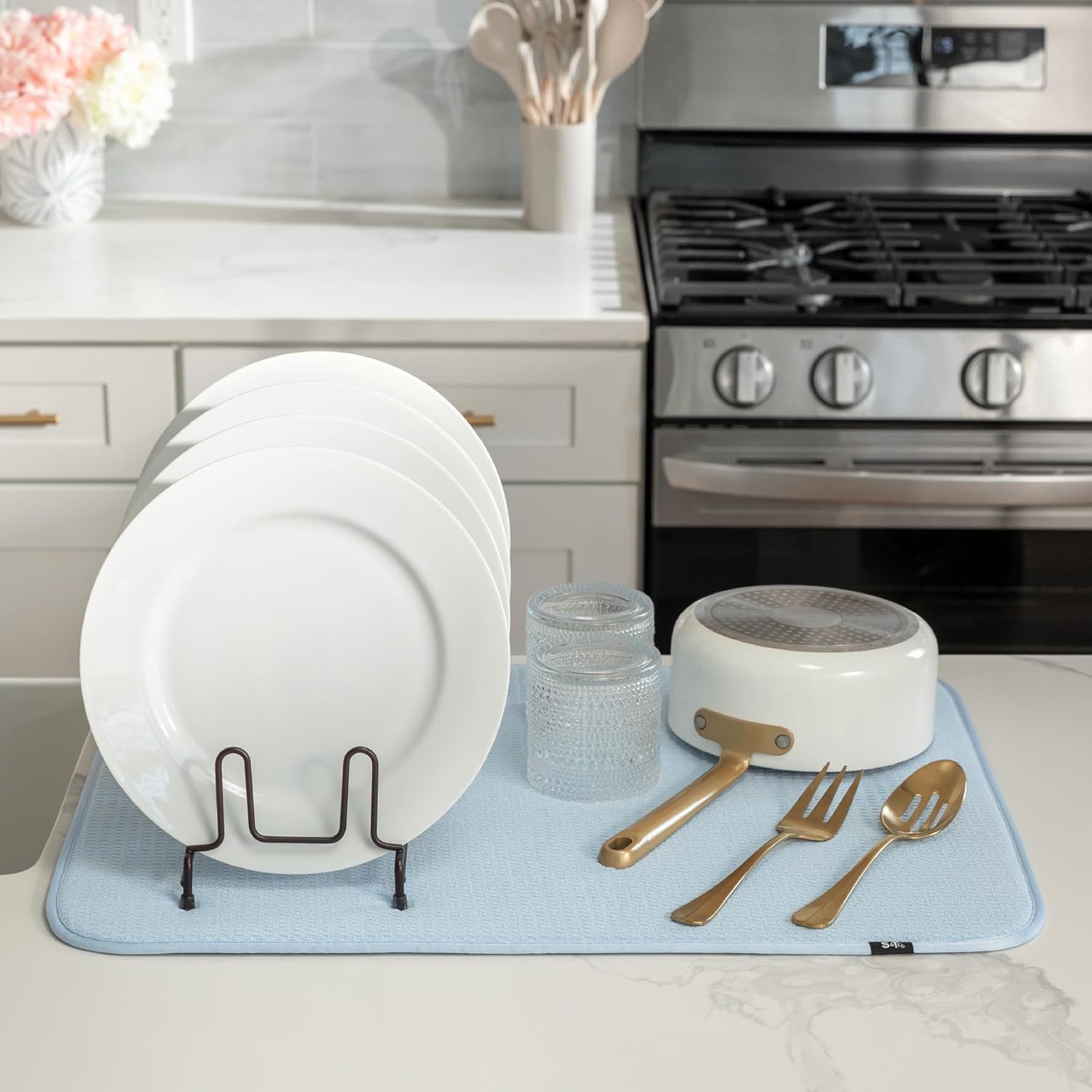 - Catch the kitchen sink drips under a dish drying rack or place your plates, forks, spoons, pots and pans set, or glassware directly on the drying mat