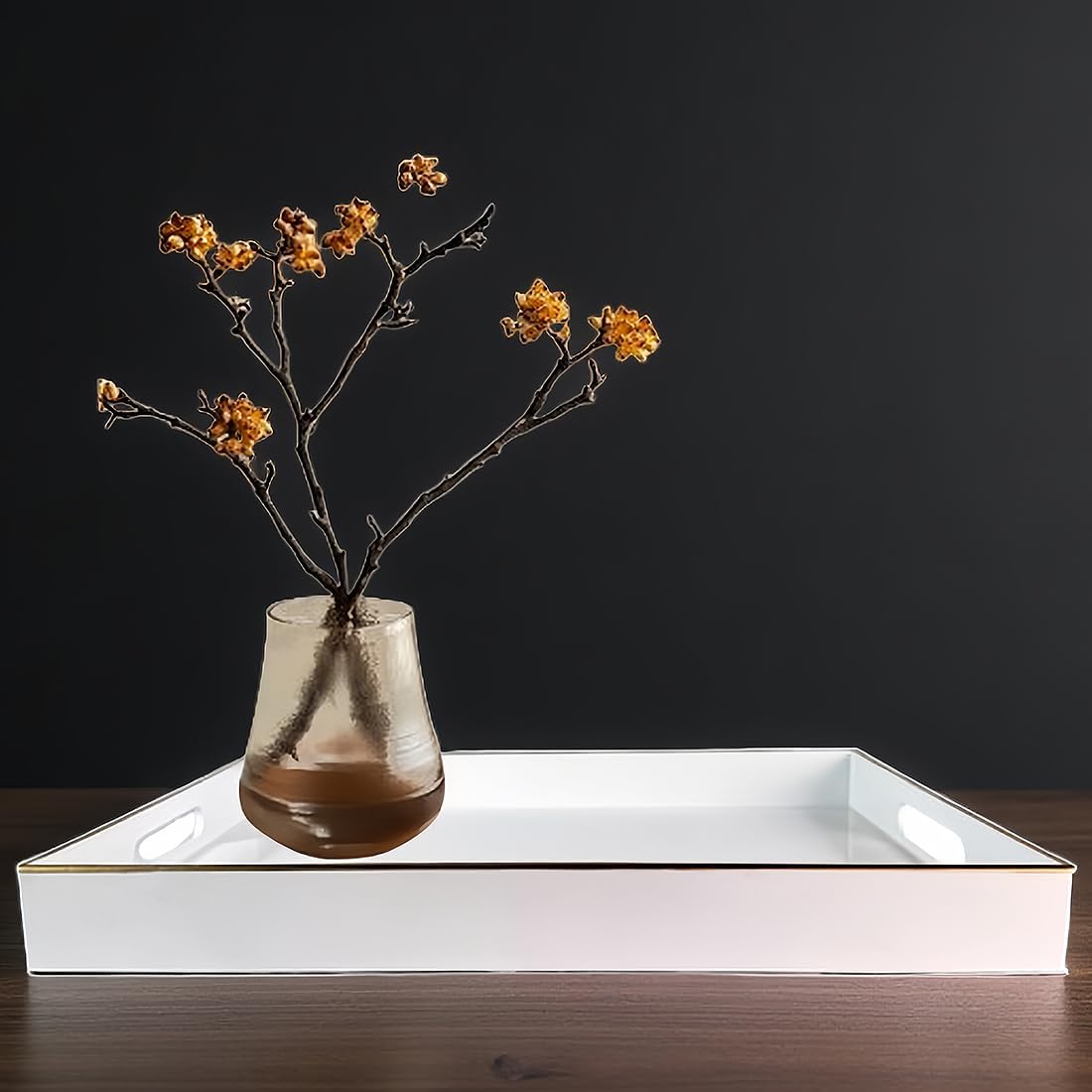 - Design: The size of the White tray is 15.7 x 11.8 inches, and it has two built-inhandles for easy carrying. lt has asimple, solid color finish with agolden top rim accent, and theedges are relatively smooth.