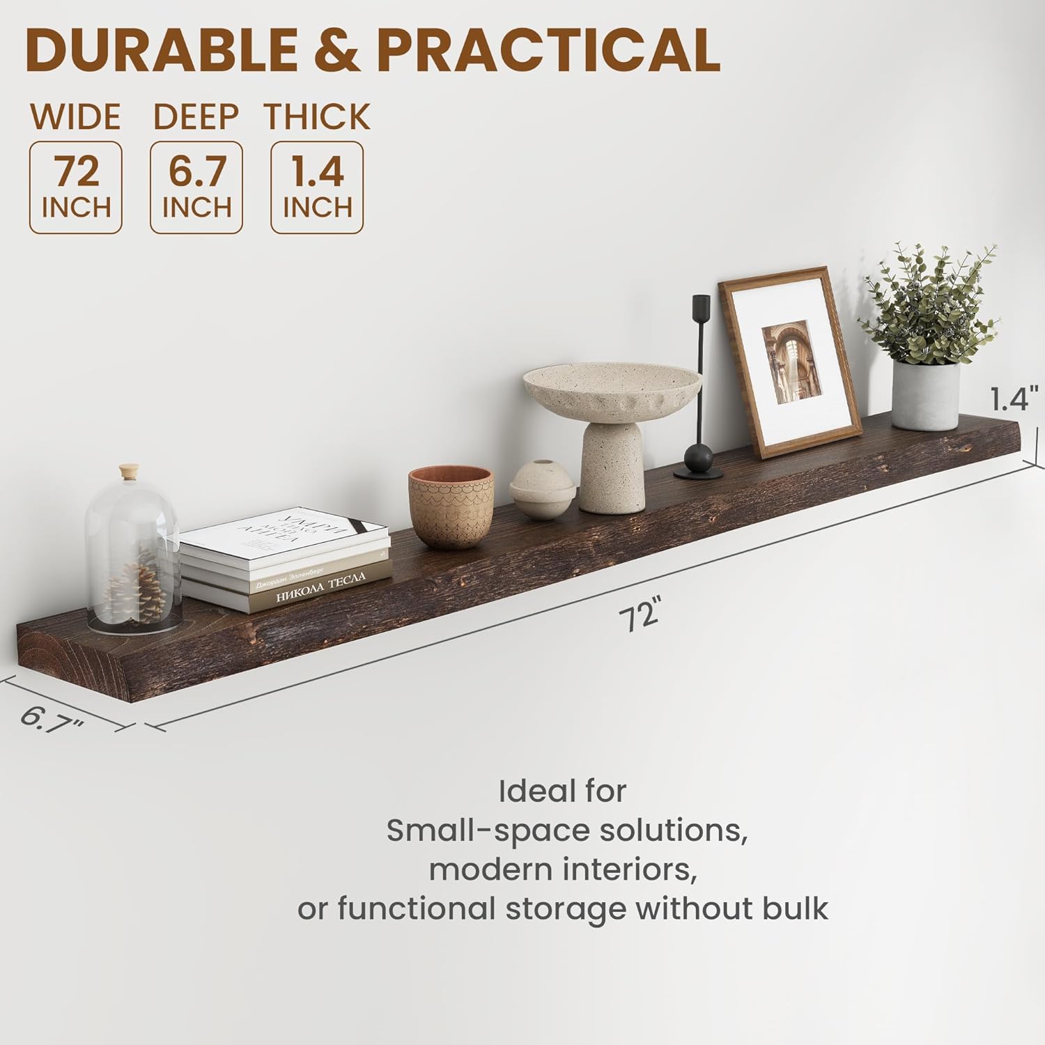 72" Floating Shelves, Live Edge Elm Wood Floating Shelf for Wall, Wall-Mounted Display Shelves with Invisible Heavy-Duty Bracket, Long Floating Shelf for Bathroom, Kitchen, Living Room, Walnut Color