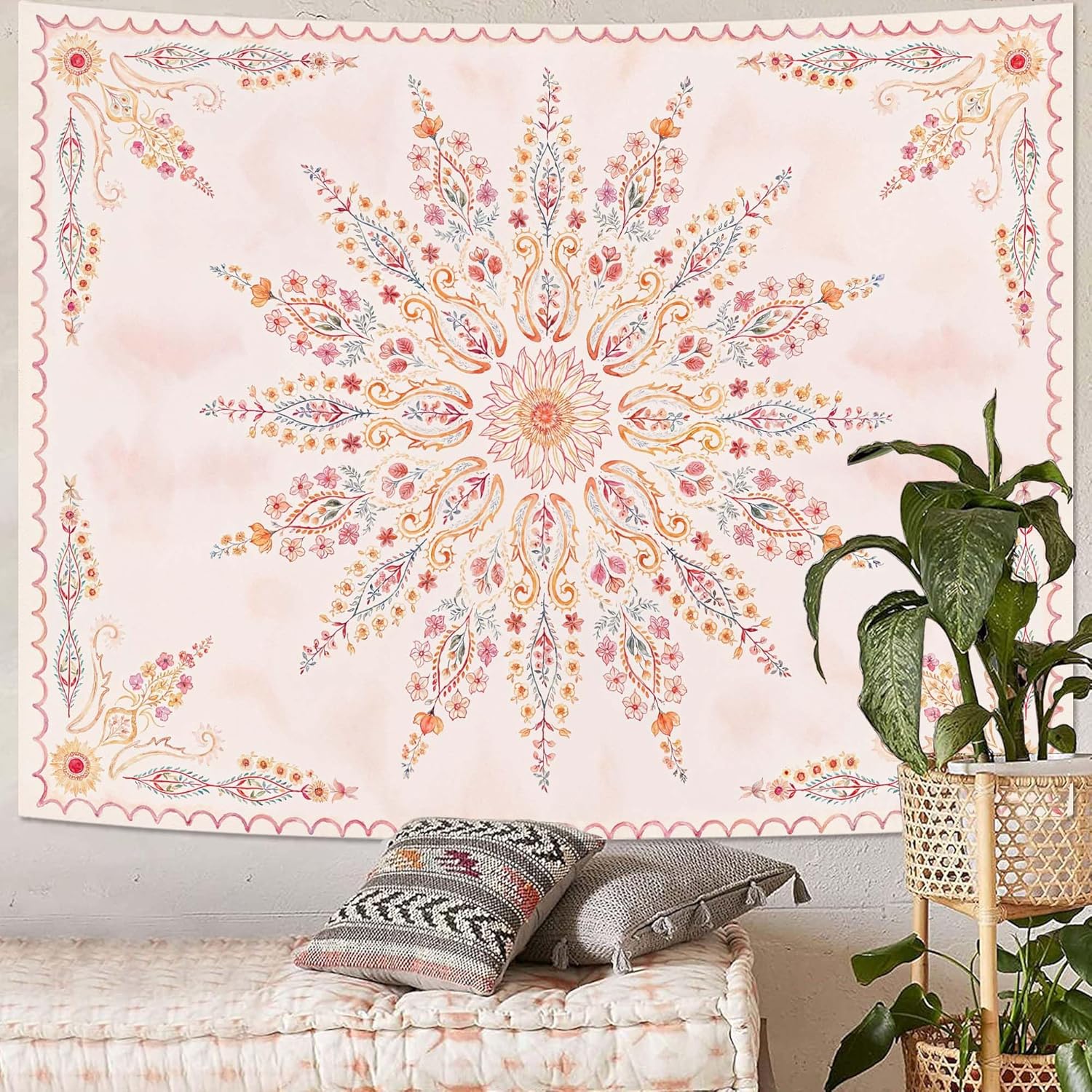 Fowocu Boho Floral Mandala Tapestry for Bedroom Aesthetic Pink Bohemian Flower Wall Tapestry Watercolor Hippie Indian Large Tapestries Wall Hanging for Living Room Dorm Decor 80 x 60 Inch