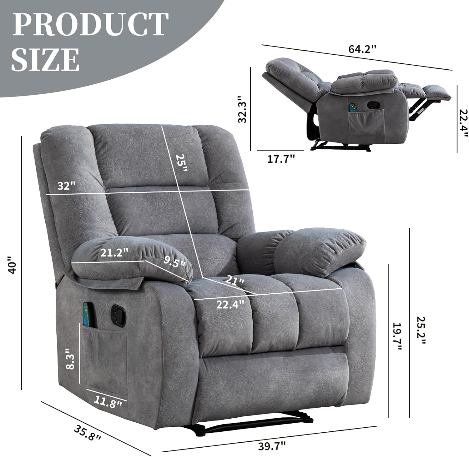 - 【Massage & Lumbar Heating】Relax in comfort with 8-point massage functionality and lumbar heating. This recliner targets key areas for your back, lumbar, thighs and legs to improve blood circulation, relieve tension, and reduce fatigue. Choose from 3 massage modes and adjustable intensity levels to customize your relaxation. The built-in timer lets you set 15, 30, or 60-minute heating sessions for convenience.