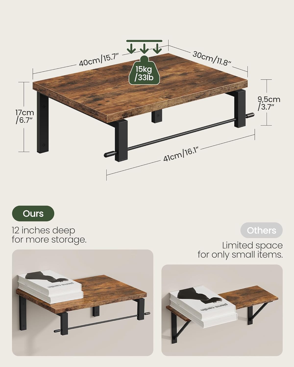 - Sturdy and Enduring: The wall shelf set is made of thick, widened particleboard that can withstand wear and tear and are easy to clean. Paired with a robust metal frame and extended screws for secure wall mounting, each shelf holds up to 33 pounds