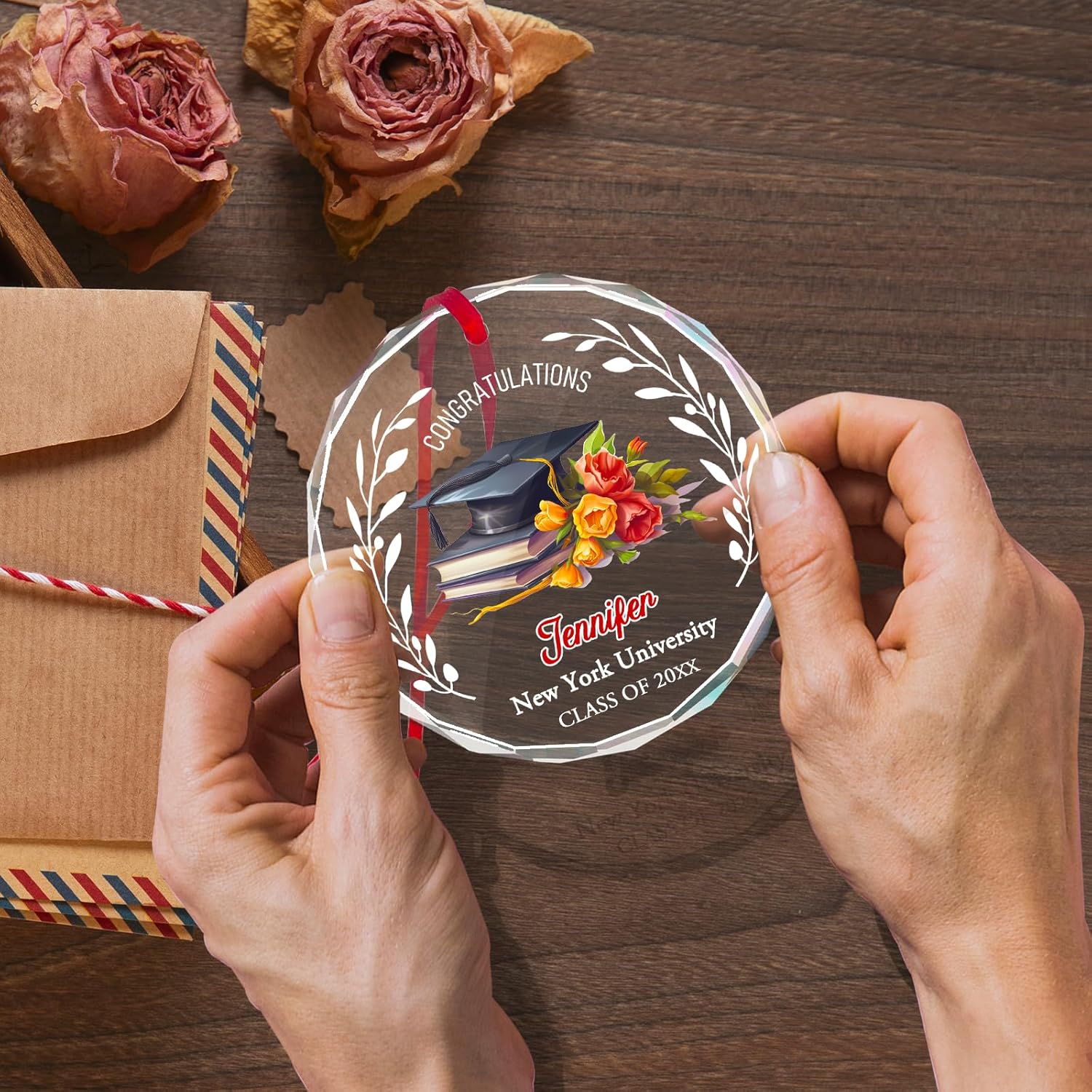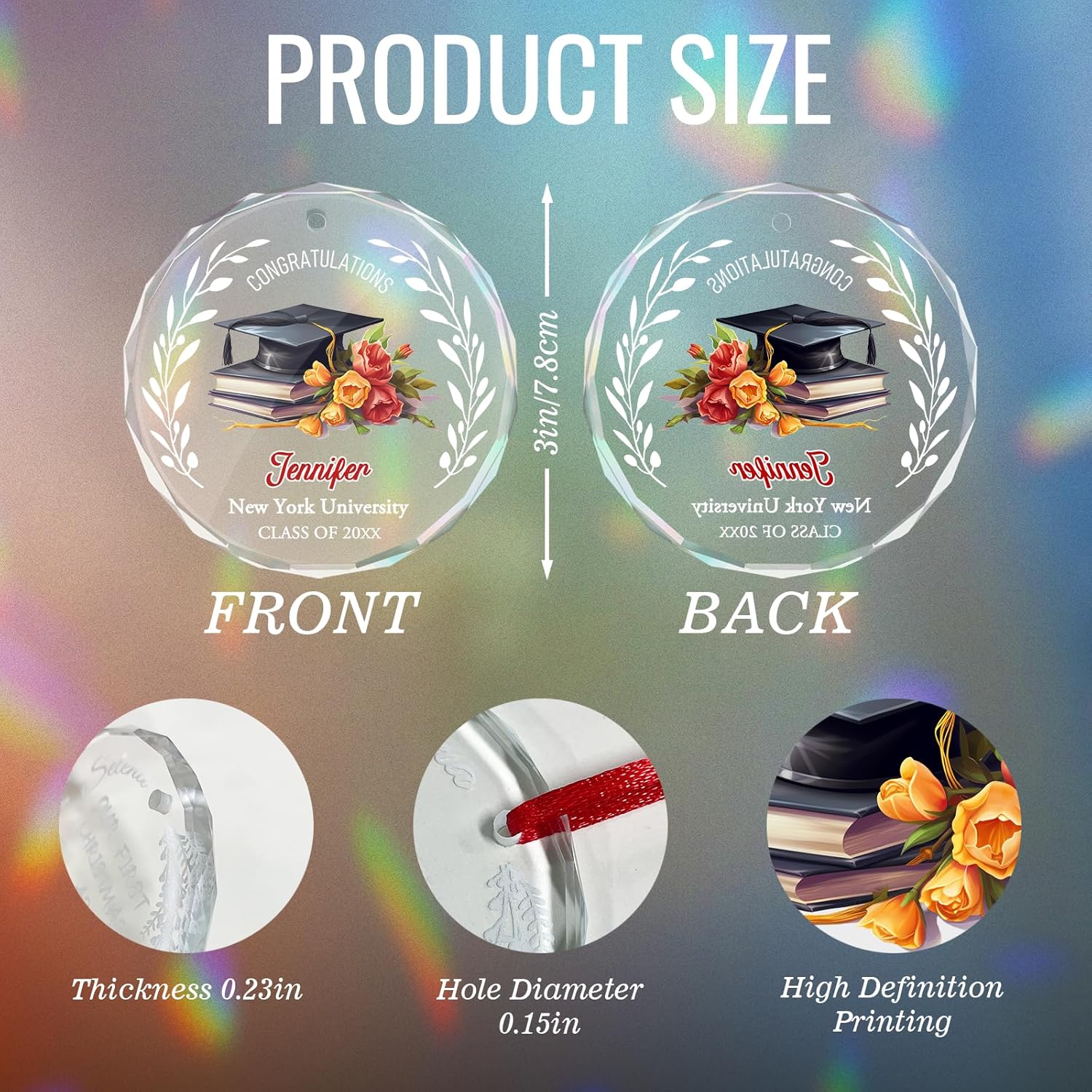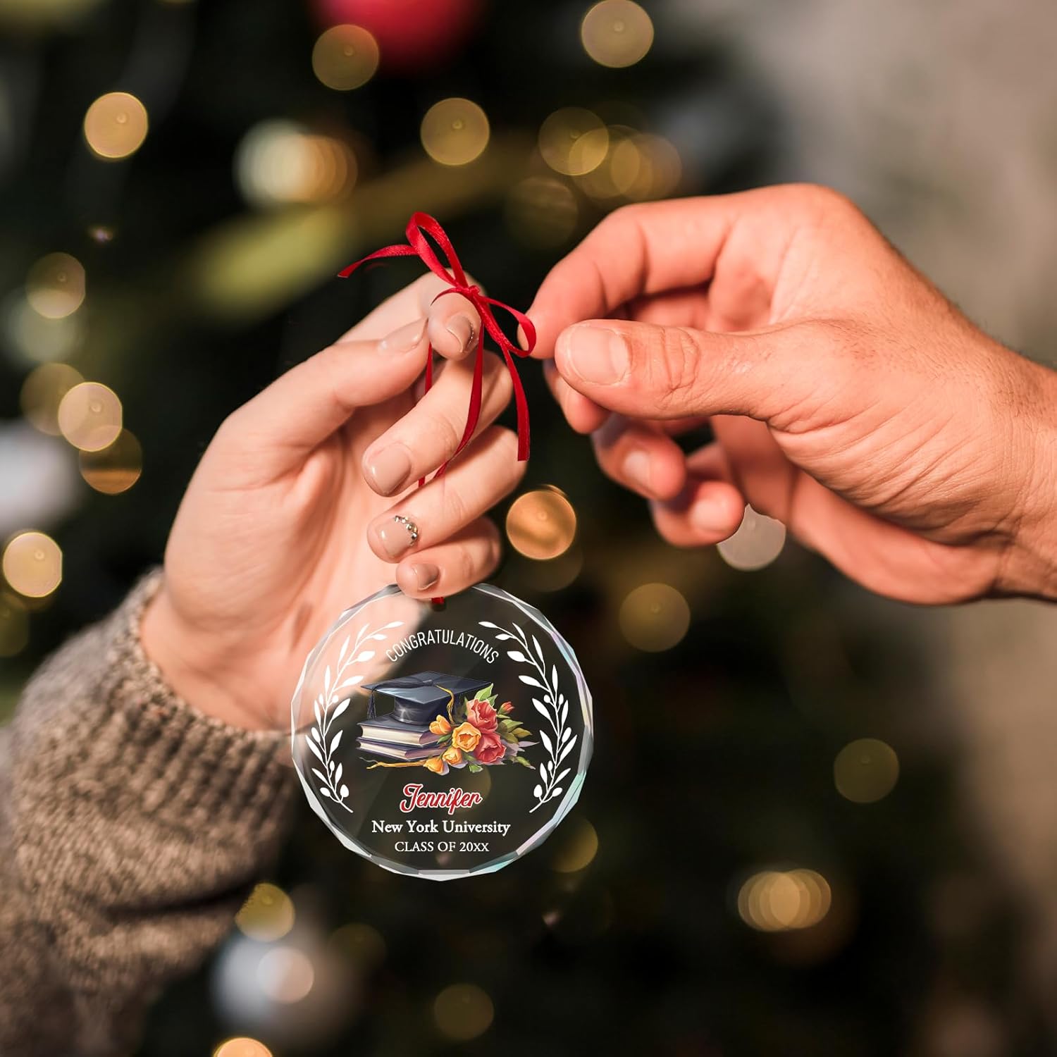 • Graduation Decor: Comes with a red ribbon, this beautiful personalized graduation glass ornament can be hung in any prominent place, desk, office, wall of honor, Christmas tree, doors, windows, walls and anywhere you want to decorate