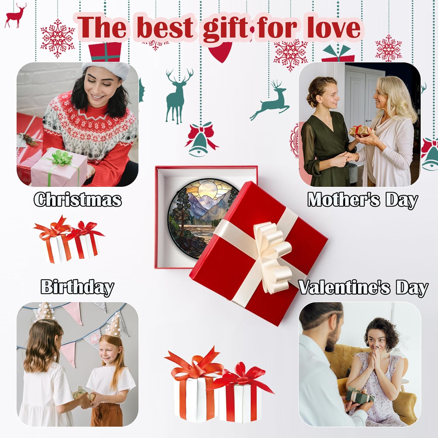 Stained Glass Window Hanging, Sunset Mountains Lake Tree Sun Catcher for Window Home Decor Landscape Suncatcher Mother's Day Birthday Gifts for Women Men Mom and Nana 7.8 in