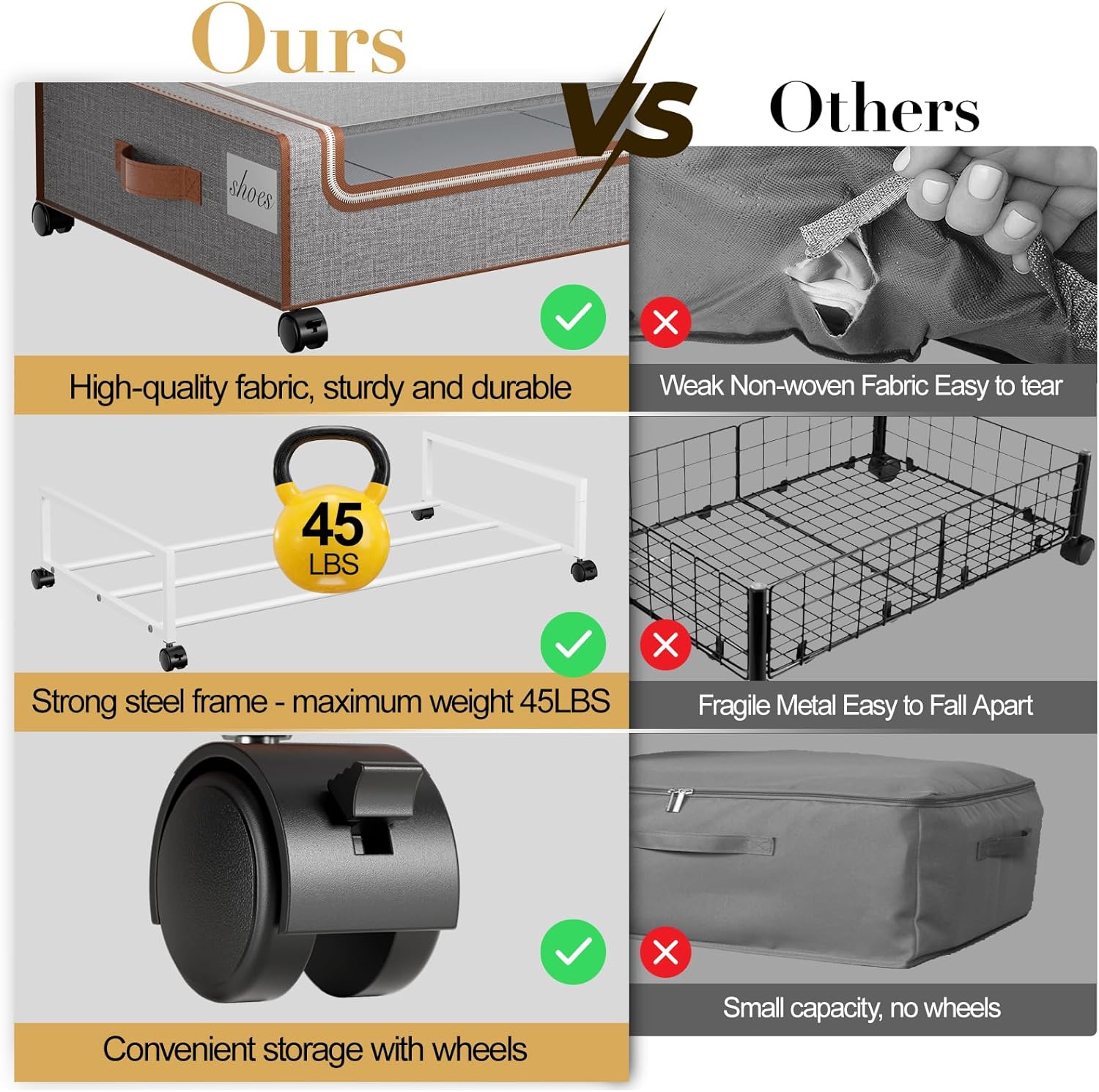 - 【Multipurpose】This underbed storage organizer easily holds out-of-season clothes, bedding, shoes, books, toys, and more. Its compact size allows it to tuck neatly under beds or sofas, in closets, or beside shoe cabinets. Additionally, by removing the bottom wheels, you can place the under bed storage flat on top of or inside your wardrobe, adding versatile storage options