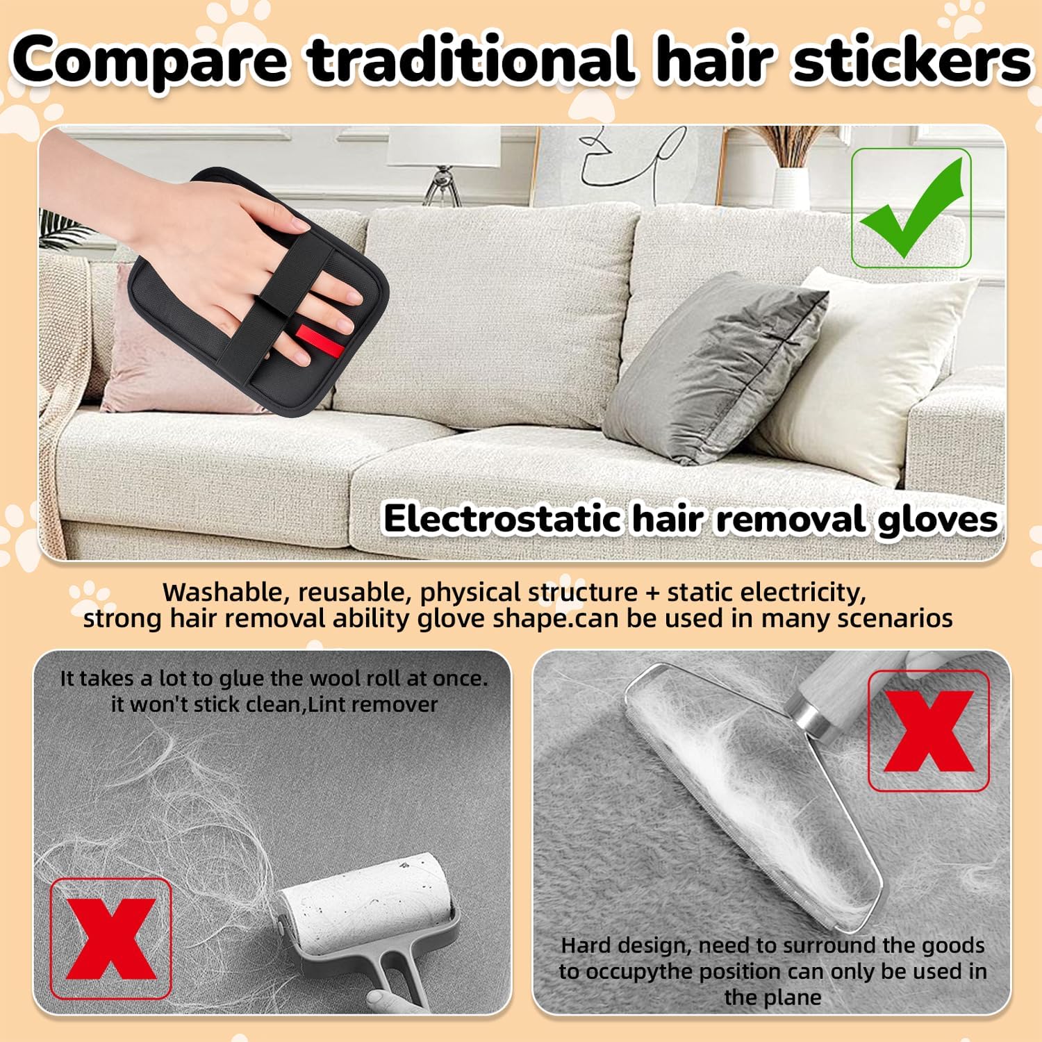 - Static electricity black technology, clean with just a swipe: It is used to remove pet hair. With a powerful static electricity adsorption technology, it can automatically suck away the hair with just a gentle swipe. Three steps to complete pet care: 1. Put on gloves 2. Gently stroke 3. Witness the fur adhering automatically. Say goodbye to complex grooming tools. Even cats, which are most afraid of grooming, will fall in love with this gentle cleaning method!