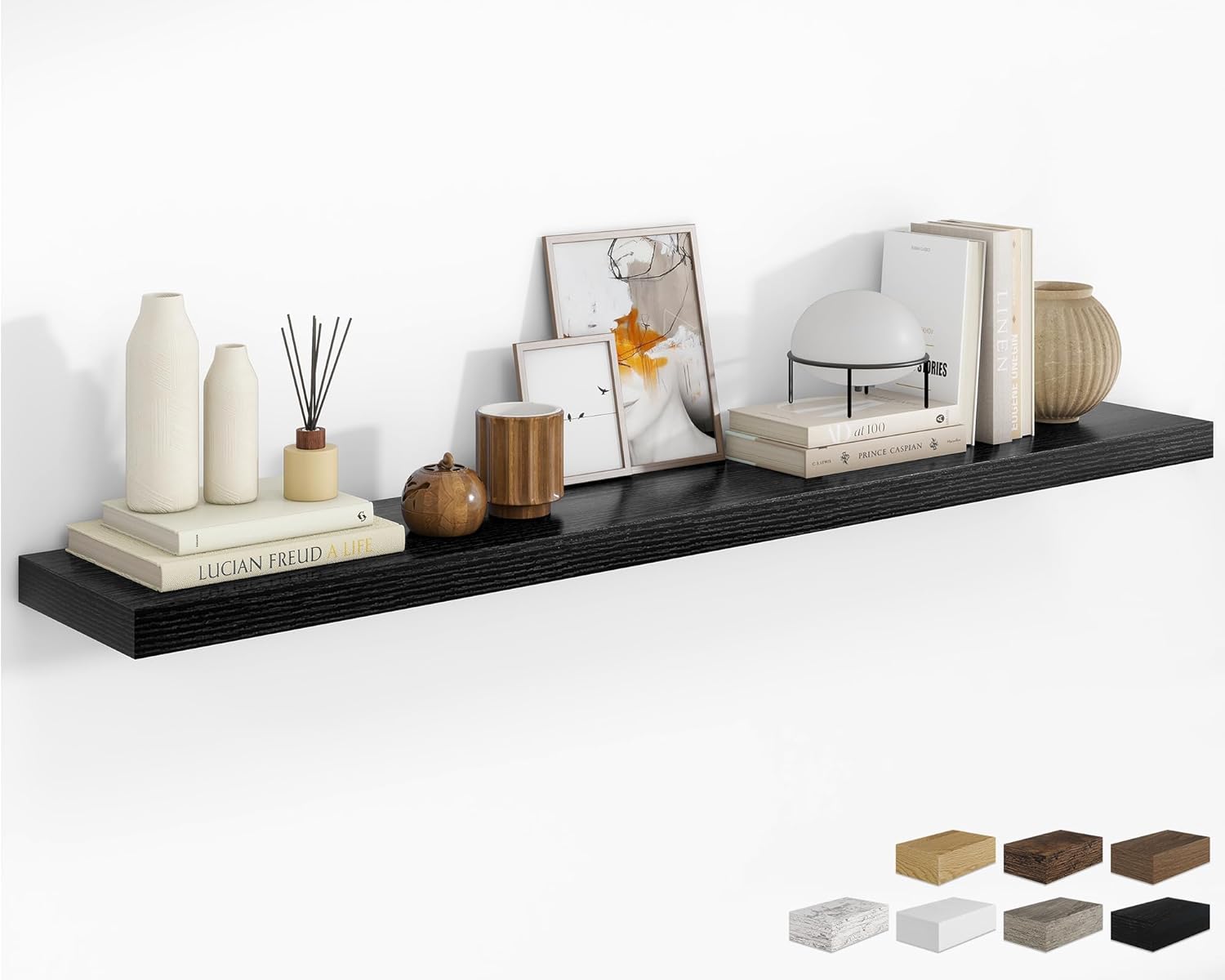 - 72 Inch Floating Shelves for Wall (Set of 1): Each wall shelves are 8 inches in depth and 1.5 inches in thickness. Our wall shelf can be used in combination, staggered high or low on the wall, or mounted side-by-side to provide extra storage space for organizing small items and clutter in multiple areas such as kitchens, bathrooms, and bedrooms, creating a clean and smooth look. Multiple colors available