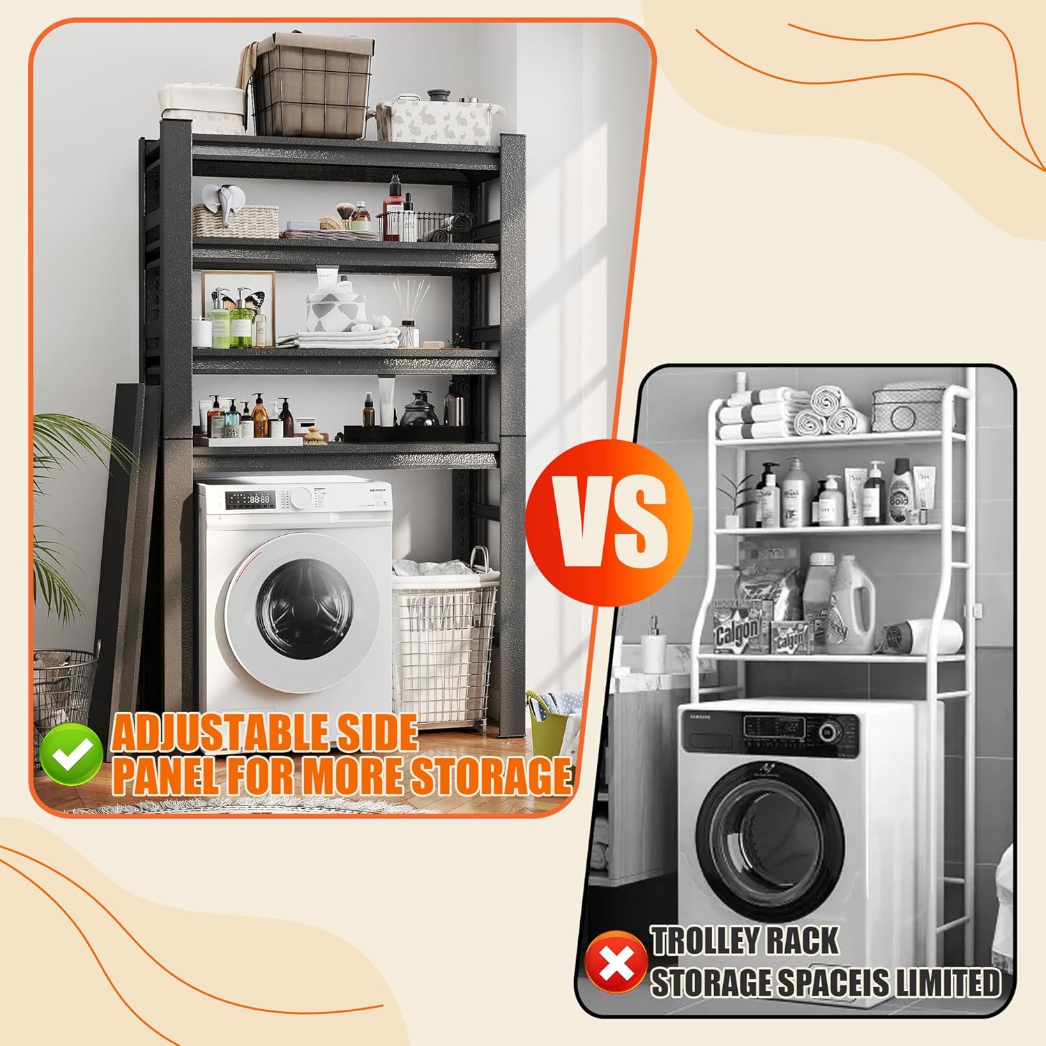 - [Ultimate Laundry Organizer & Spill-Proof Design] Instantly reclaim wasted space with this premium over-the-washer storage shelf. Designed to create 5 tiers of efficient organization, this laundry room organizer features a crucial protective side fence on each shelf, preventing detergents, softeners, and supplies from ever getting knocked over and creating a mess.