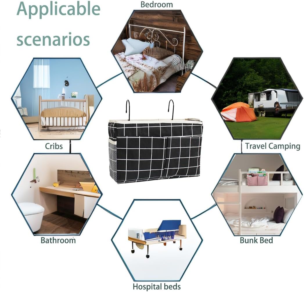 - 【Multi-scene Application】This bed caddy organizer is Perfect for bedrooms, dorm bunk beds, hospital beds, crib rails, RVs, and more. The caddy can secure attachment to bed frames,or railings, saves space and ideal for compact living.