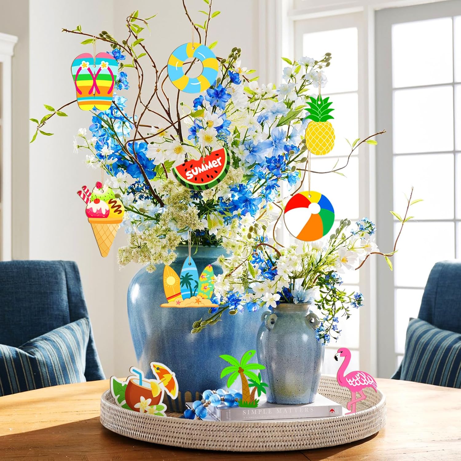 80PCS Wooden Summer Ornaments to Paint, 10 Styles DIY Blank Unfinished Wood Beach Cutouts Ornament for Crafts Hanging Decorations, Watermelon Surfboard Slippers Coconut Tree Home Decorations Gifts