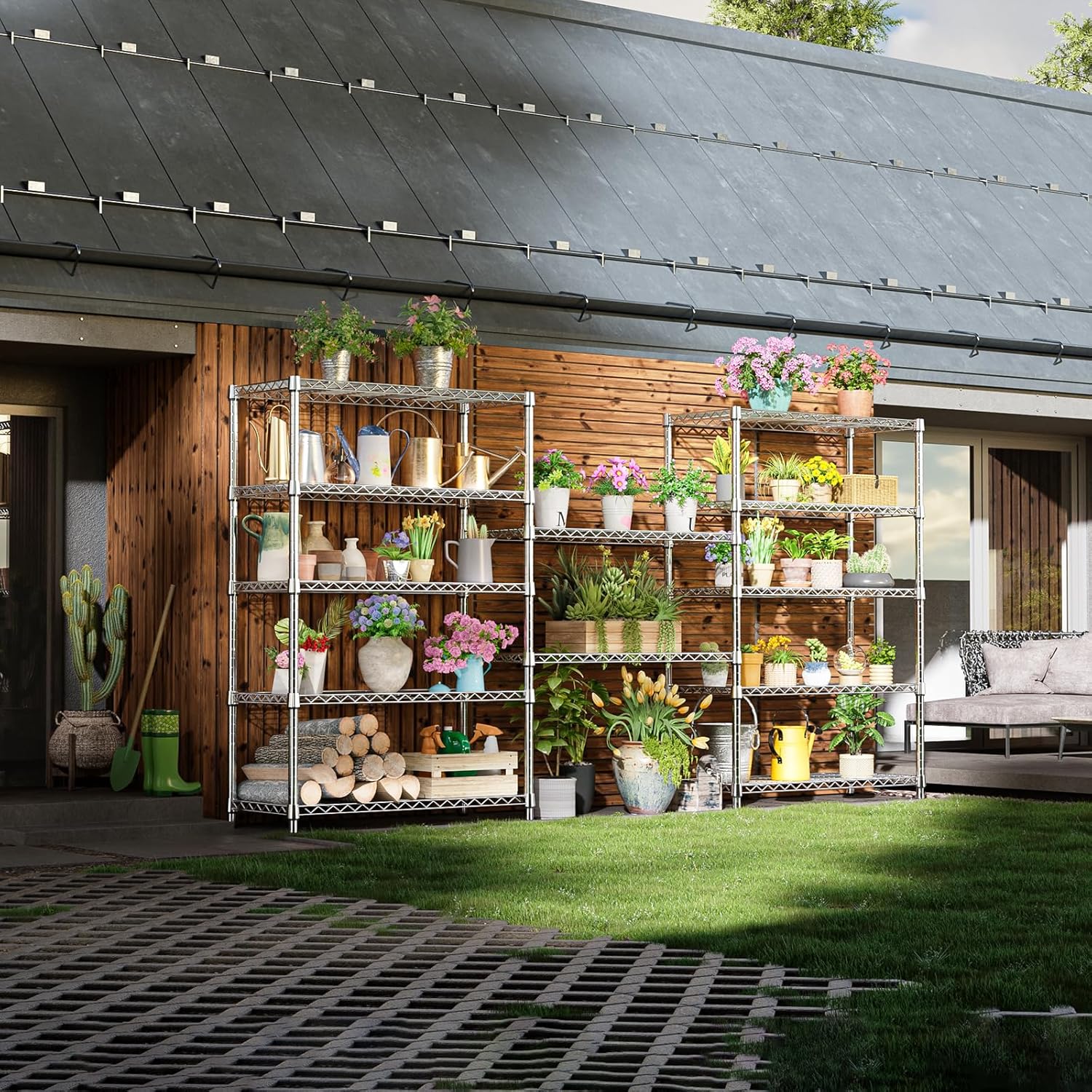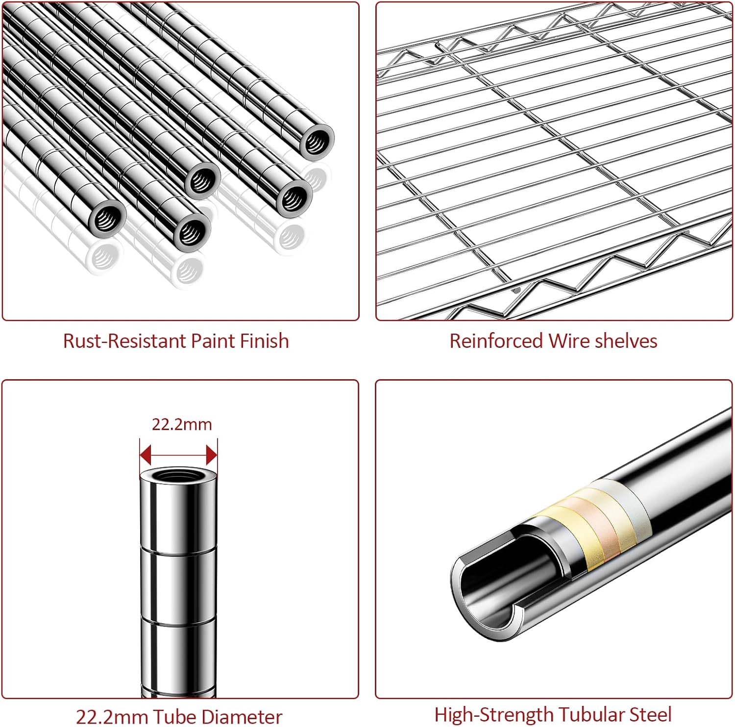 - 【Adjustable Shelves – Flexible for All Needs】Customize your storage your way. Each shelf can be easily adjusted in 1-inch increments to fit items of varying sizes—from bulky tools to compact kitchenware. This wire shelving unit adapts to your unique storage needs, creating a more organized and efficient space.
