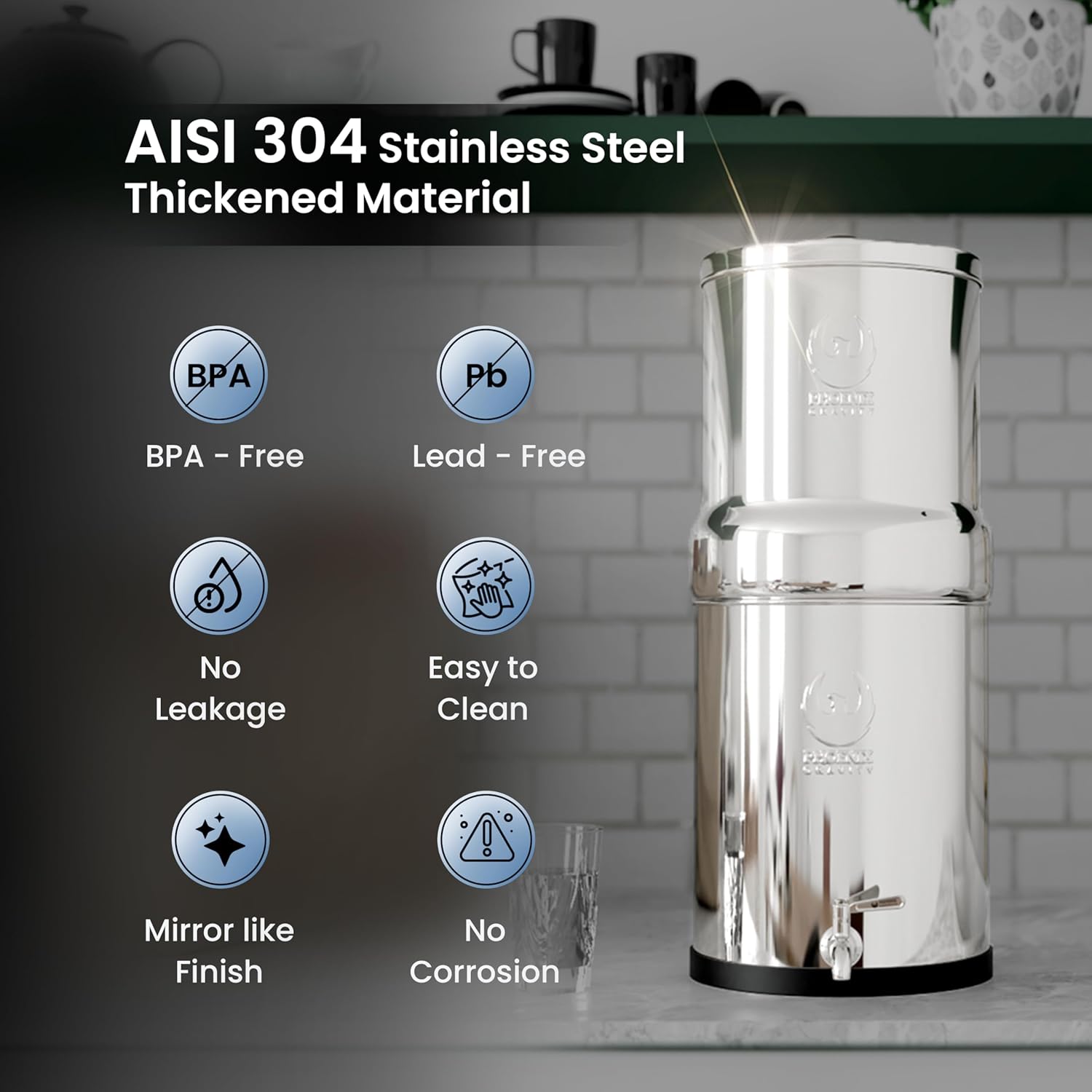 - 𝐏𝐫𝐞𝐦𝐢𝐮𝐦 𝐀𝐈𝐒𝐈 𝟑𝟎𝟒 𝐒𝐭𝐚𝐢𝐧𝐥𝐞𝐬𝐬 𝐒𝐭𝐞𝐞𝐥 𝐂𝐨𝐧𝐬𝐭𝐫𝐮𝐜𝐭𝐢𝐨𝐧 - Constructed from durable, food-grade AISI 304 stainless steel, the Phoenix Gravity system boasts a sleek, mirror-like finish that resists rust, stains, and corrosion. This combination of style and functionality makes it a great addition to any space. Its sleek and durable design also enhances portability, making it ideal for camping and outdoor activities.