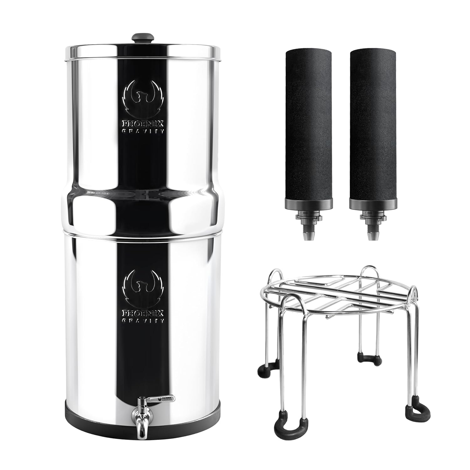 - 𝐀𝐥𝐥-𝐈𝐧-𝐎𝐧𝐞 𝐒𝐨𝐥𝐮𝐭𝐢𝐨𝐧 - The Phoenix Gravity system comes complete with an AISI 304 stainless steel tank, 2 Smart Carbon (Black) filter elements, a user-friendly AISI 304 stainless steel stand and Spigot, and all necessary components for easy assembly, making it ready to use right out of the box.