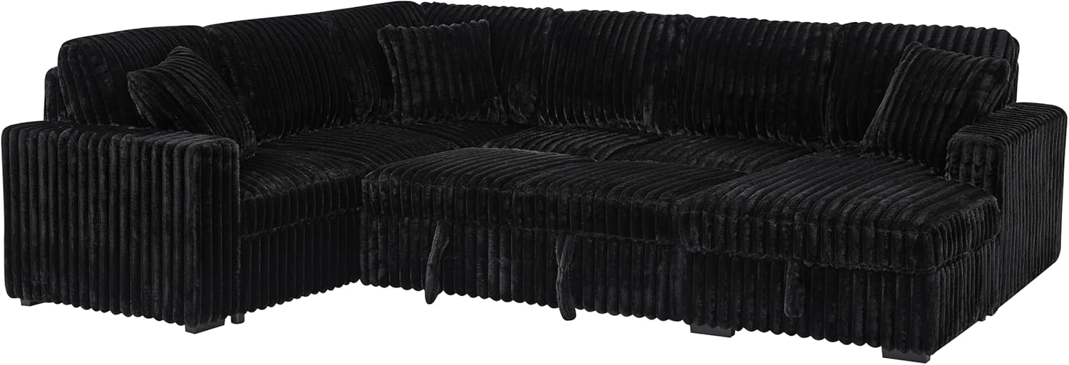 THSUPER 122-Inch Oversized U Shaped Plush Corduroy Fluffy Sectional Sleeper Sofa with Pull Out Bed, Storage Chaise Lounge and USB Charging Port - Black