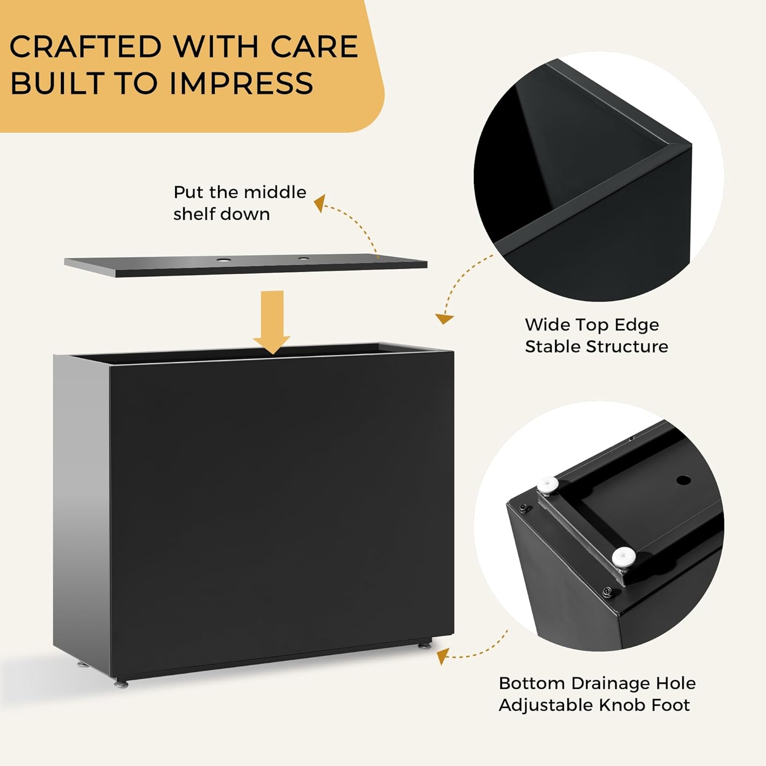 Tall & Long Metal Planter with Middle Shelf, 36W x 11D x 30H Large Rectangular Outdoor Planter Box, Span Divider for Garden, Patio, Yard | Easy 5-Min Assembly, Drainage Holes, Adjustable Feet, Black
