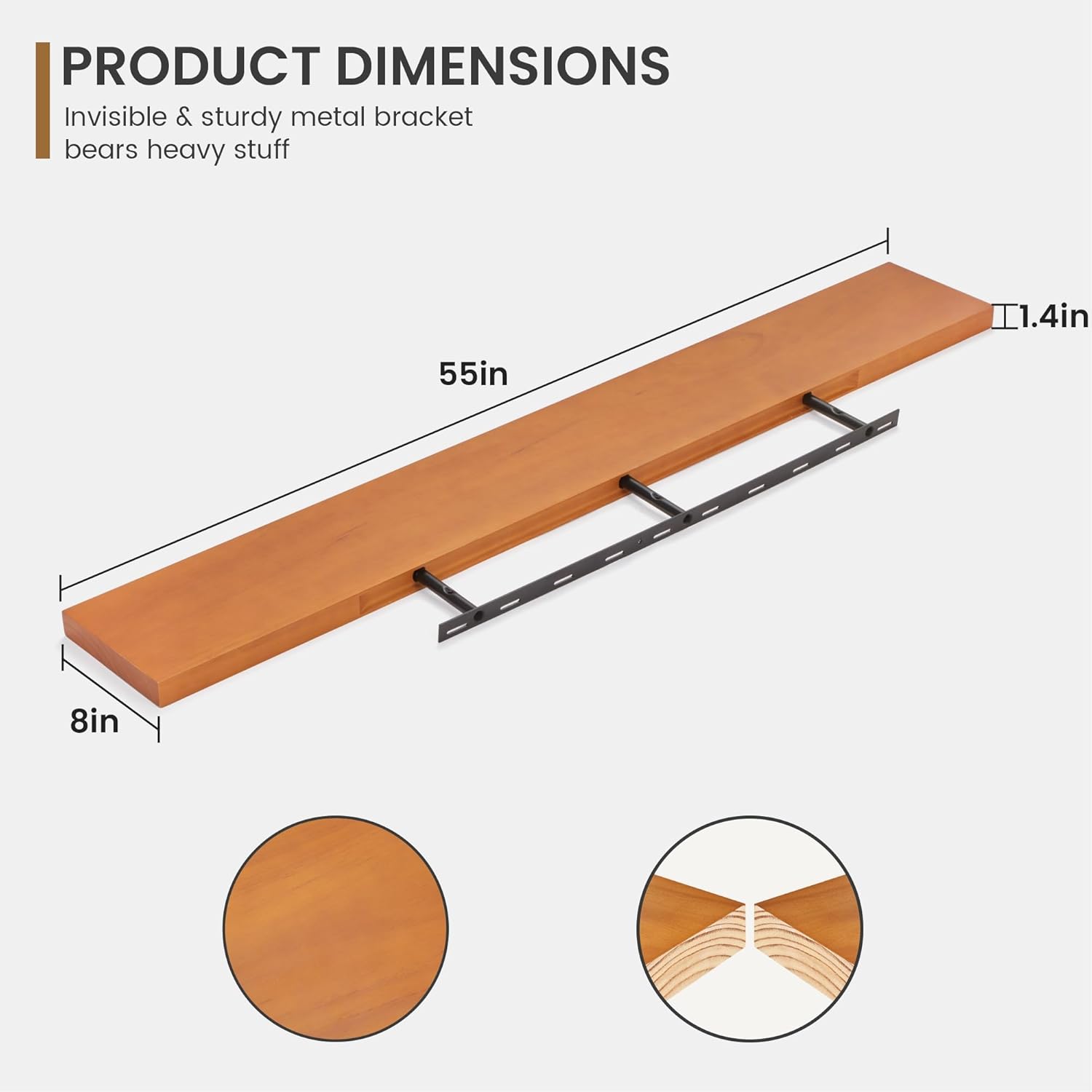 - Extra Deeper & Thicker for Storage - Each board measures 55"W x 8"D x 1.4"H. Extra deeper and thicker design in order to bring maximizes storage space and weight capacity, even hold up to 60 lb. This floating shelf taking up zero square feet, reduces clutter and highlights décor in compact spaces. It can help make full use of the empty wall, making it much more space-saving and making your room look larger and tidier.
