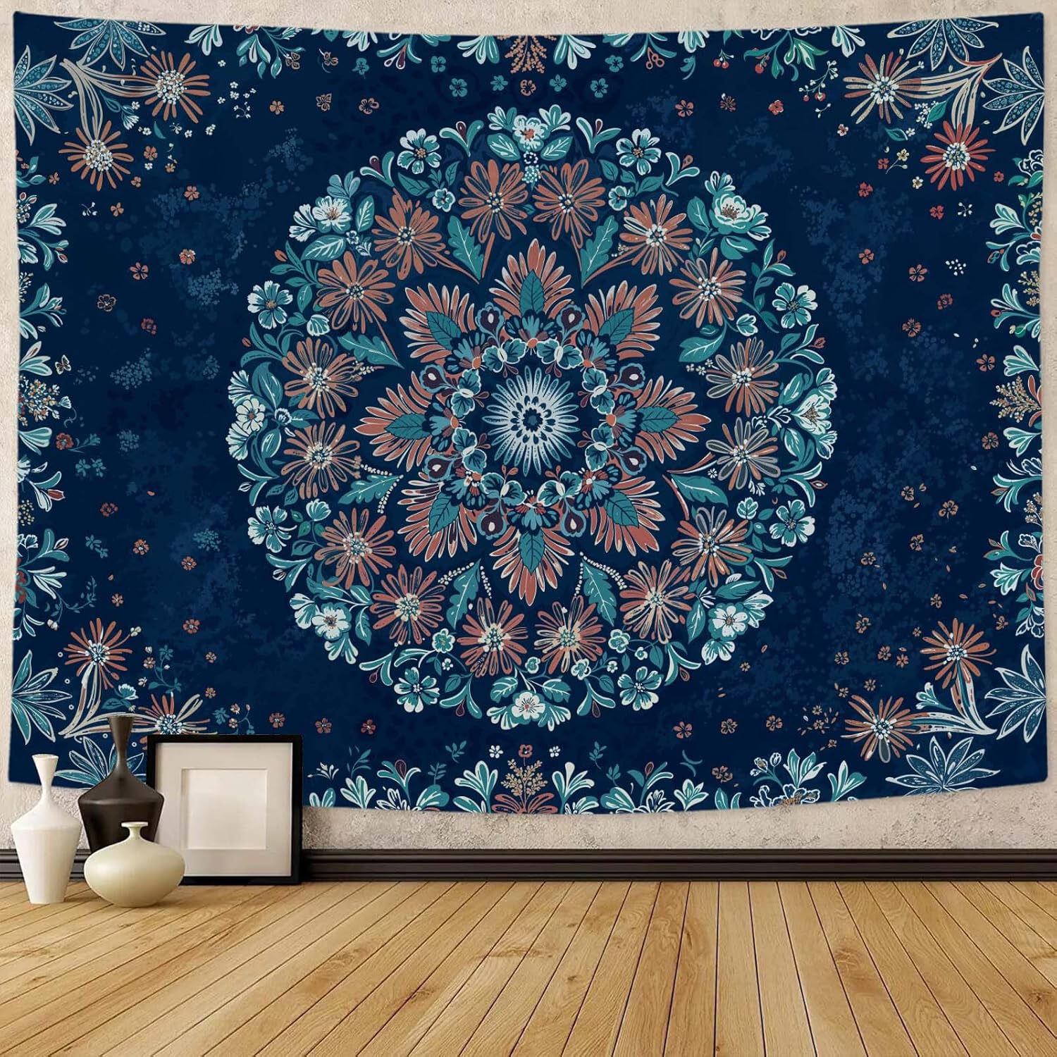 Fowocu Boho Floral Mandala Tapestry Wall Hanging Blue Bohemian Flower Medallion Tapestry Aesthetic Vintage Navy Hippie Indian Small Tapestries for Bedroom Living Room Dorm Decor 48 x 36 Inch