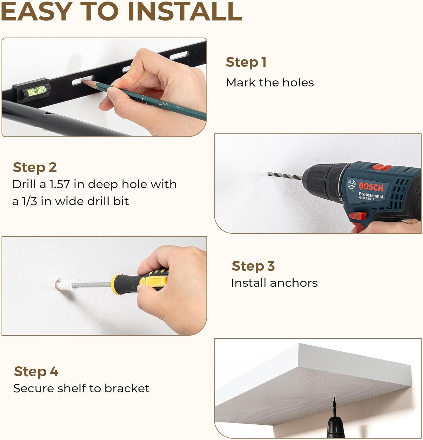 - Sturdy & Secure design: These 36-inch floating shelves feature a durable, concealed mounting bracket that offers reliable support for your belongings. Engineered for hassle-free and stable installation, each shelf includes all the required hardware to ensure a strong, wobble-free hold—perfect for showcasing your favorite decor, photos, or everyday items with confidence and style.