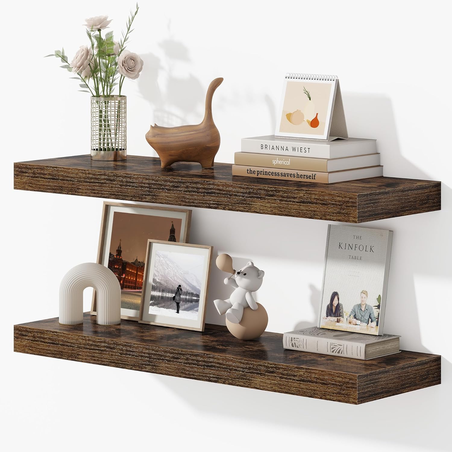 - Blending Rustic Warmth with Modern Style: These 32-inch hollow-core floating shelves perfectly combine the cozy charm of farmhouse design with a sleek, modern edge. Crafted from high-quality engineered wood, the natural-looking wood grain adds inviting texture and character to any space. Whether installed side-by-side, staggered, or tucked into a corner, they offer a clean, versatile look that complements both classic and contemporary décor.