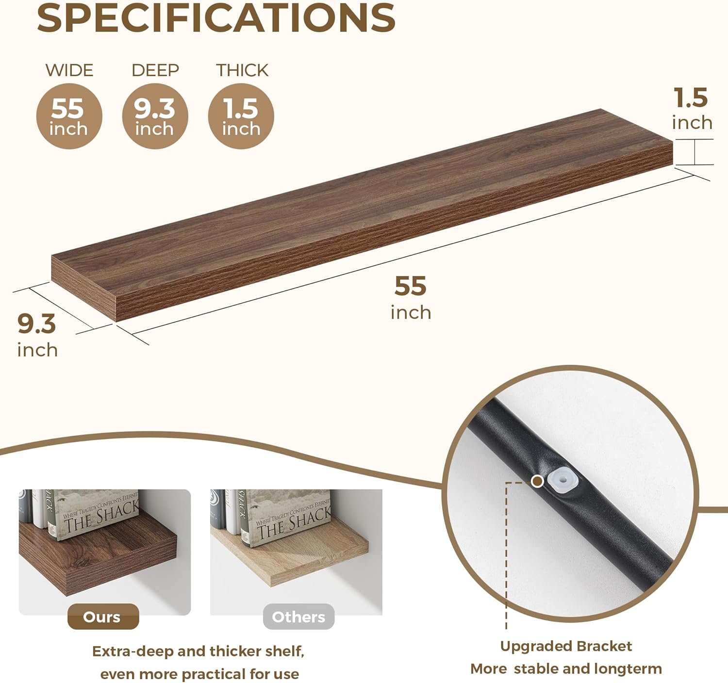 Dreamland 55 Inches Floating Shelves for Wall, 9.3" Deep Long Floating Shelves Set of 1, Large Display & Storage Shelf, Wall Shelf for Bathroom Bedroom Living Room Kitchen Office, Walnut