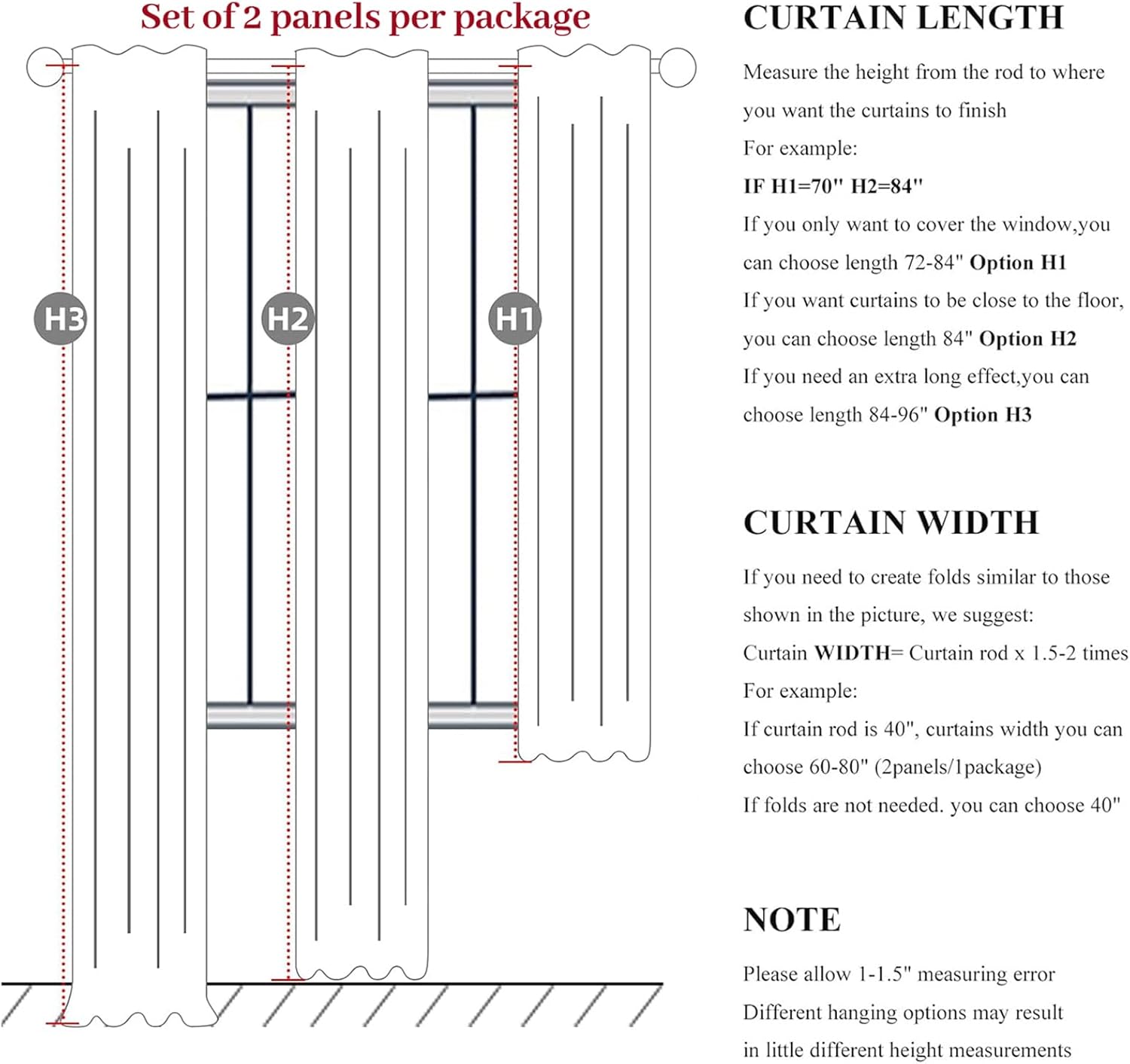 - Ready Made:Set of 2 pinch pleated curtain panels per package with 16 metal rings and 16 adjustable plastic hooks(The adjustable hook can raise and lower the height of the curtain by 1 inch),Each panel measures 40"W x 92"L,pair measures 80"W x 92"L
