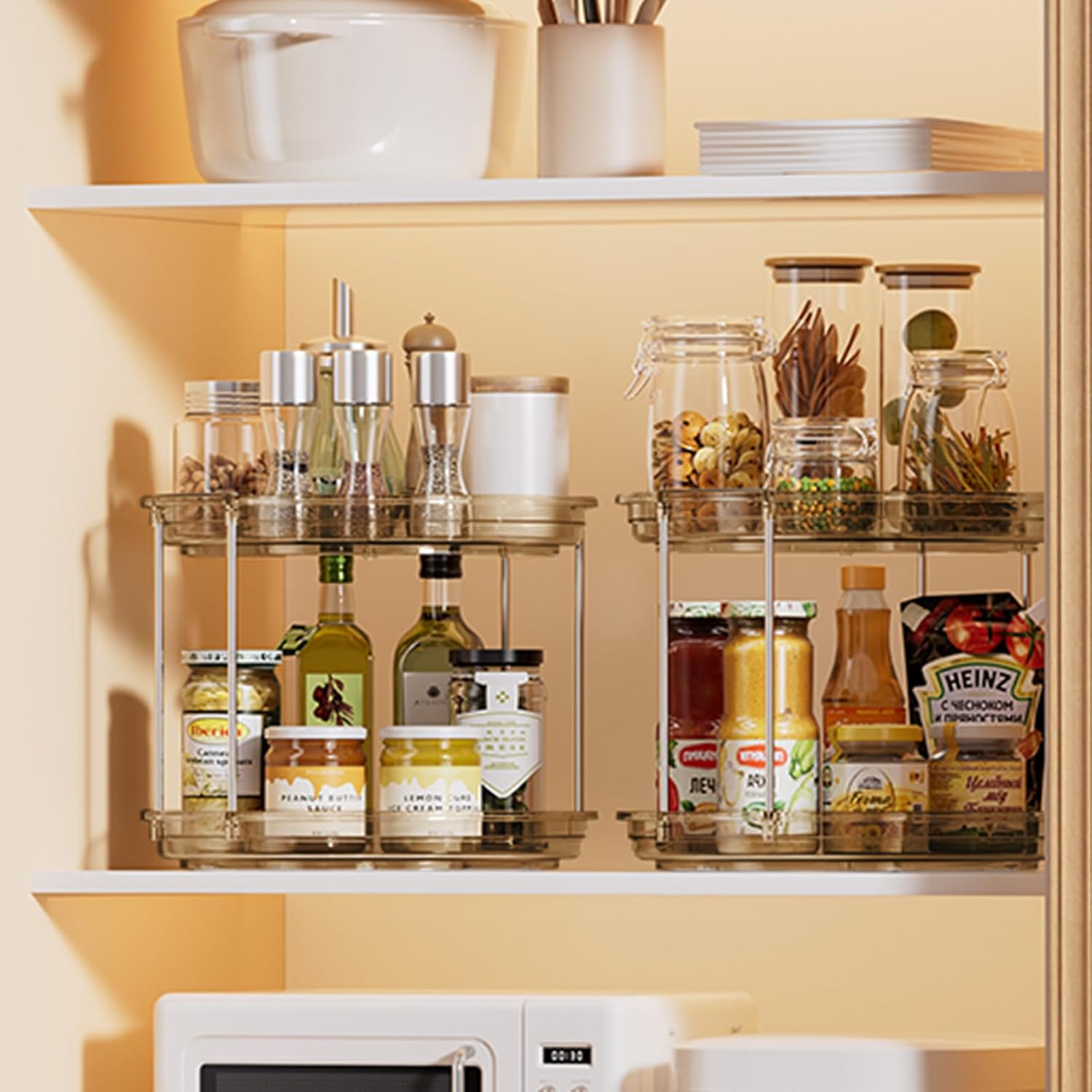 - Maximize Vertical Space: This spice rack organizer fit for narrow cabinet because 2 tier design that doubles storage capacity without occupying additional horizontal space. This small lazy Susan Improves the utilization of compact space and stores more items in a limited area