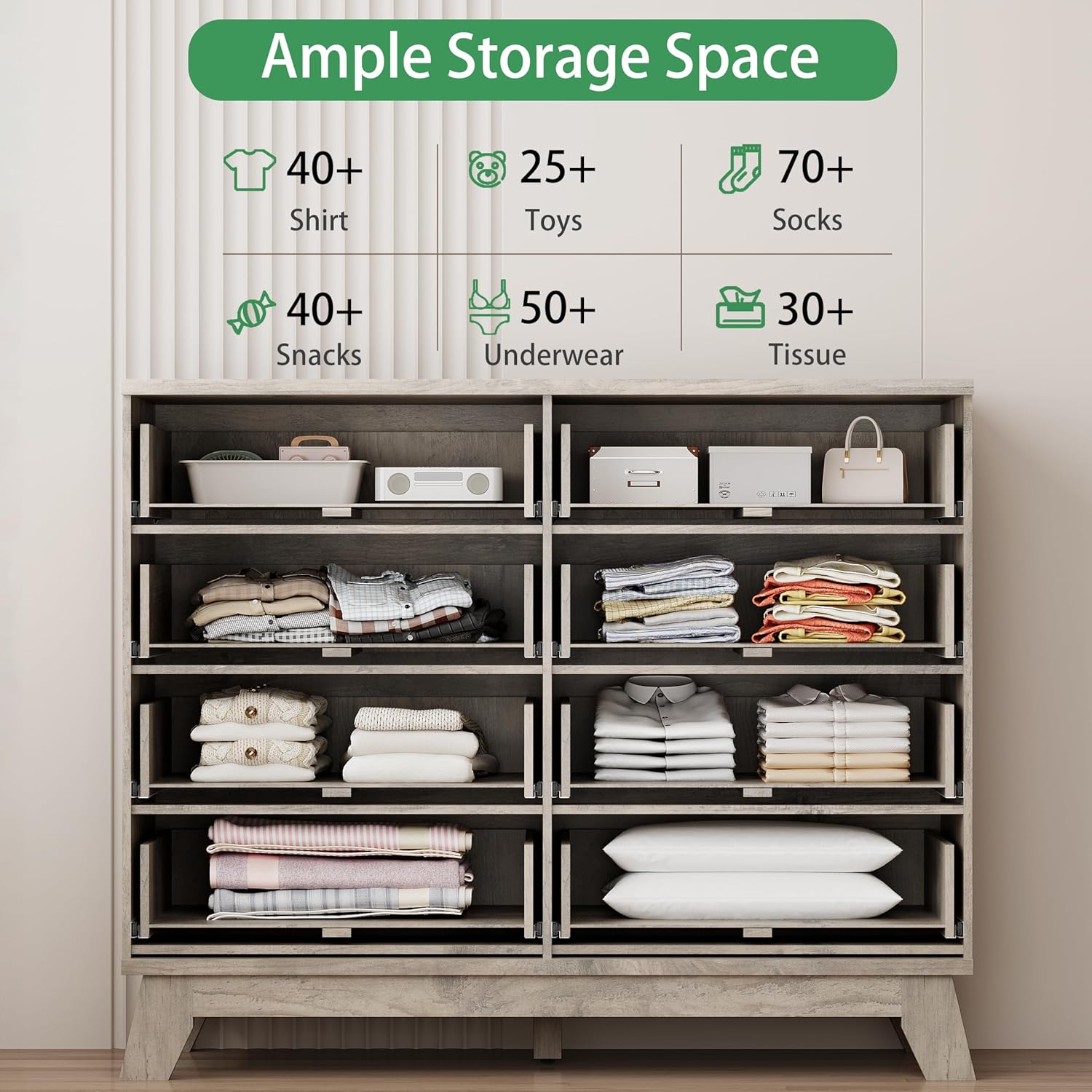 - γLarge Storage CapacityγThe dresser for closet features 8 deep drawers that provide plenty of room for organizing clothing, bedding, cosmetics, or jewelry, helping you maintain a neat and tidy space. The wide wooden tabletop can serve as a dresser TV stand or display your decorations such as photo frames, plants or mirrors. Perfect for bedroom, living room, hallway, entryway