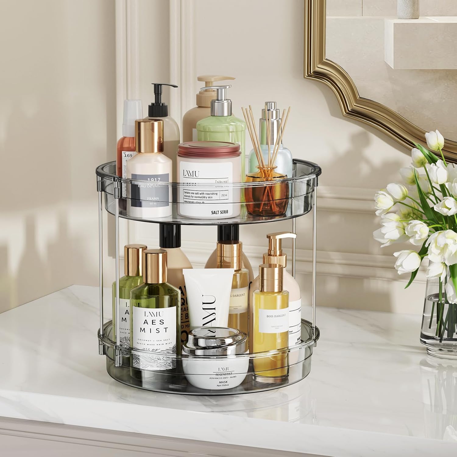 LAMU 12 inch 2 Tier Lazy Susan Turntable Organizer Rotating Spice Rack Organization for Cabinet, Kitchen, Pantry, Countertop, Bathroom, Vanity, Medicine Cabinet Organizer, Grey