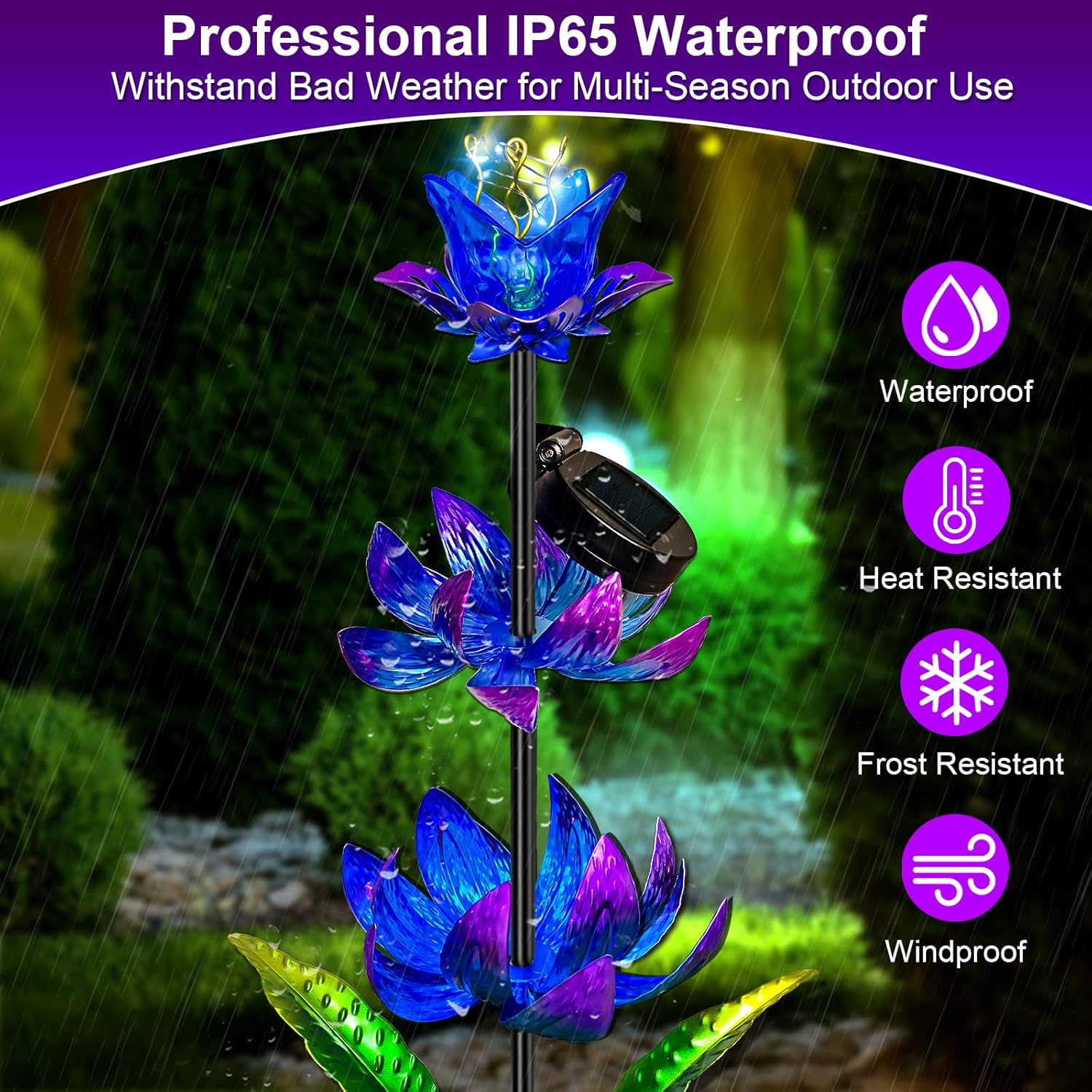 - 【Elegant Three-Layer Flower Design】 Inspired by nature, this solar garden decor features a stunning three-layer flower design with vibrant colors. Crafted from durable metal and coated with a rust-resistant finish, it adds a touch of charm to your yard decor while standing up to harsh weather.
