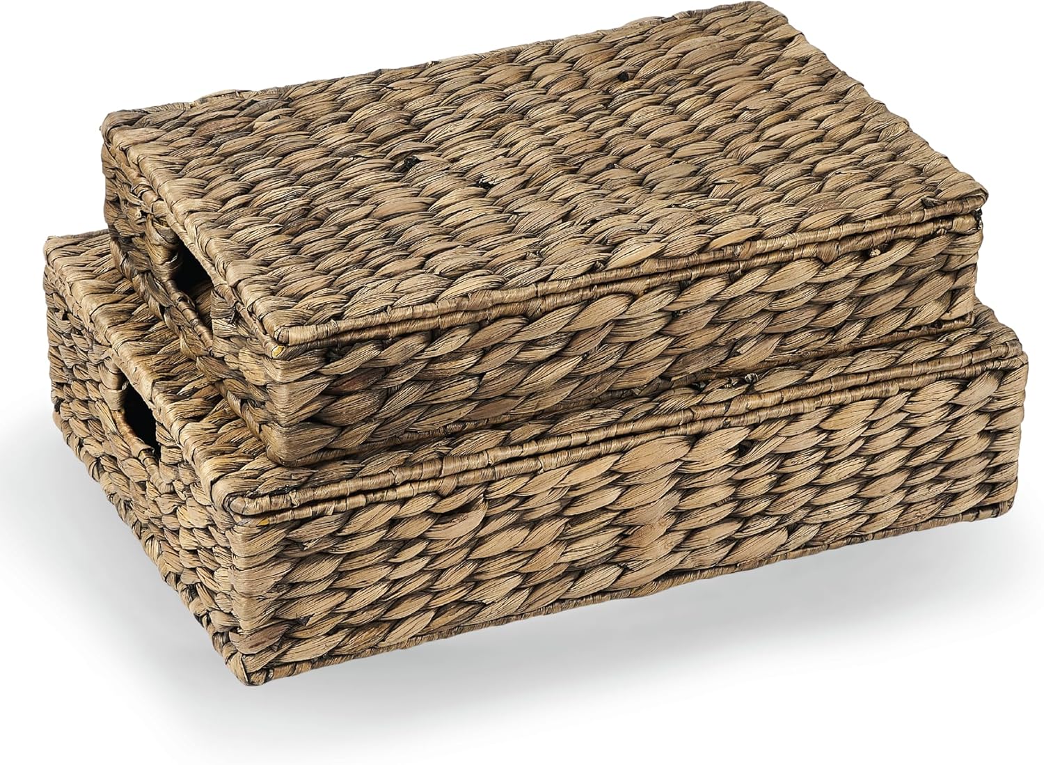 - Versatile Storage Solution: Use these wicker storage baskets with lid to neatly organize mail, office supplies, remote controls, chargers, data cables, makeups, socks, or underwear, keeping your essentials within easy reach but out of sight.