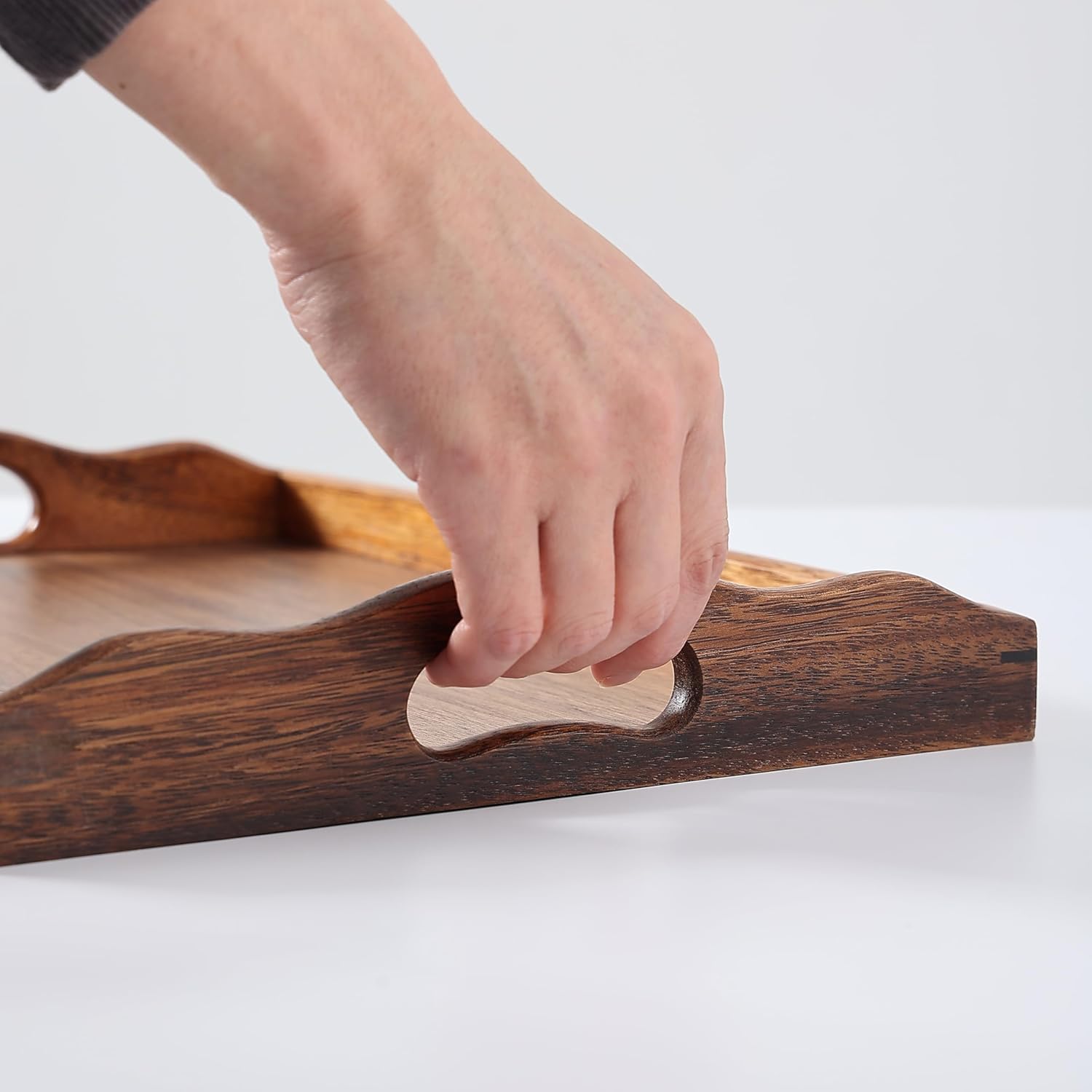 - Sturdy wood tray with handles designed for effortless transport. Suitable as a kitchen tray for counter organization or a butler tray for serving guests. Lightweight yet durable for daily use